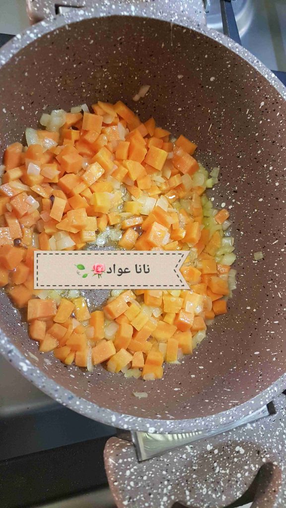 نقطع الجزر مكعبات صغيره او برش على حسب الرغبه ونضعه فوق البصل وندبله