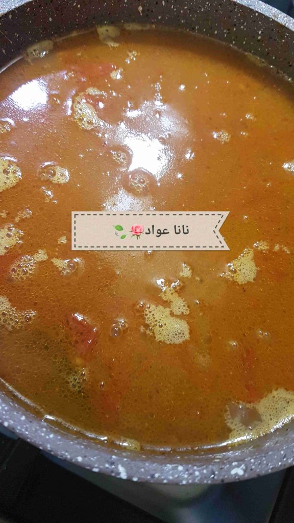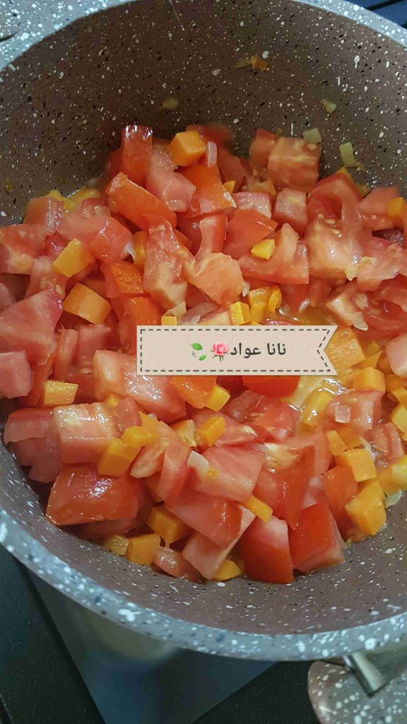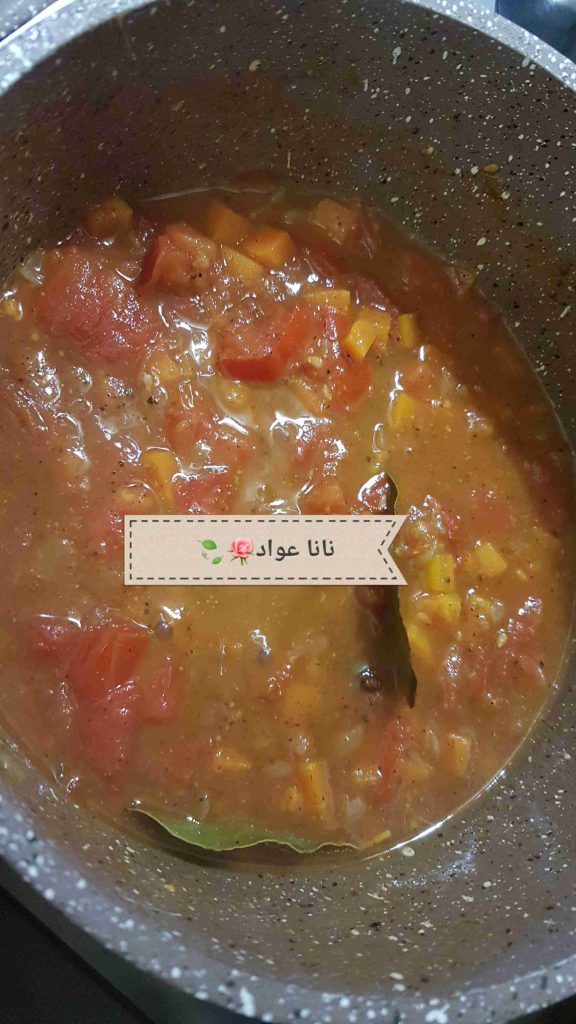 نغسل الرز ونديره فوق البندوره ونحرك جيدا