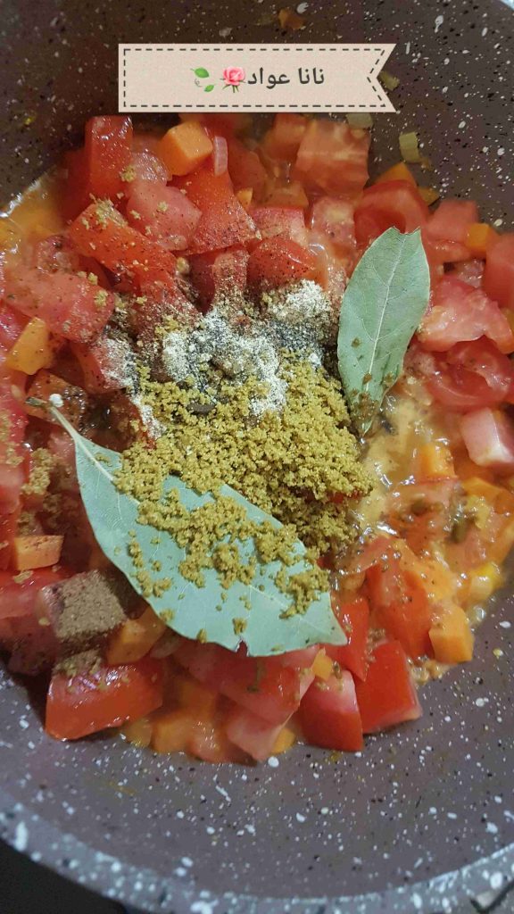 نضع جميع البهارات فوق البندوره من ورق غار وقرنفل تلات حبات وفلفل اسود وقرفه وزنجبيل ومكعب ماجي ونحركهم جيدا ونتركهم الى ان تستوي البندوره تمام وتنشف المي