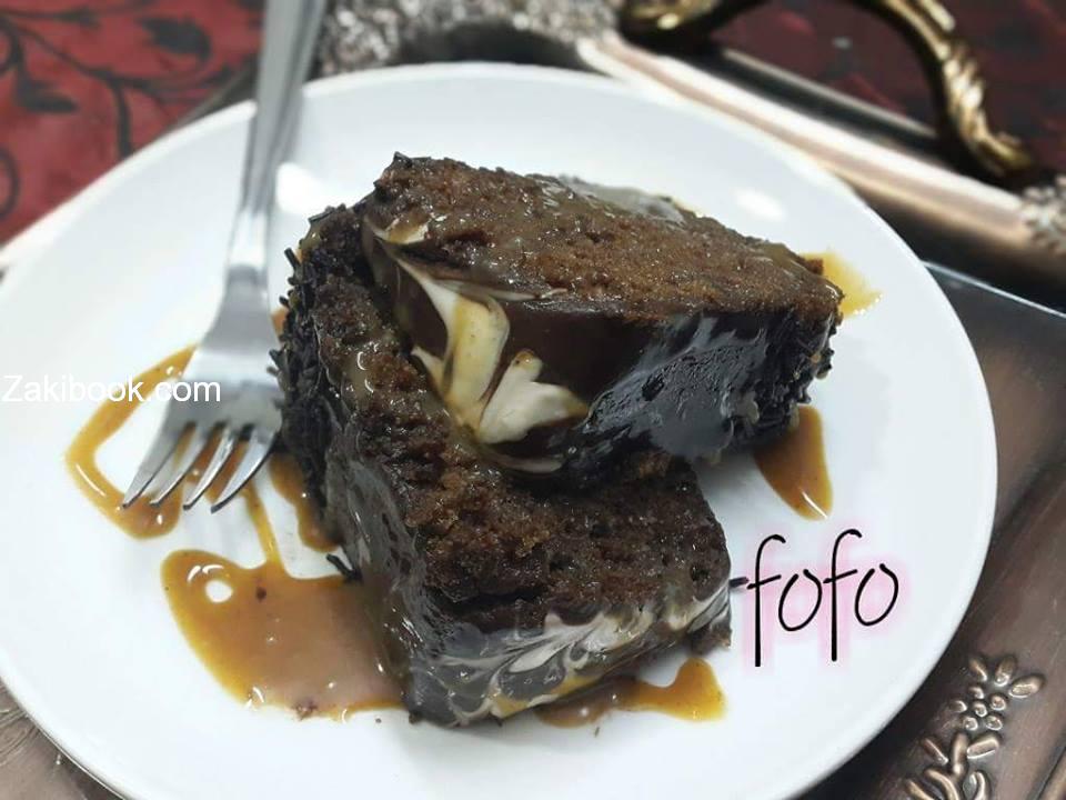 – و نصب الخليط بالصينية و عالفرن بس طلعت شربتها بمشروب نيسكافية و كاكاو مع حليب بس بارد يكون و زينتها بصوص الشوكولا و قشطة.