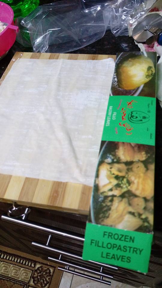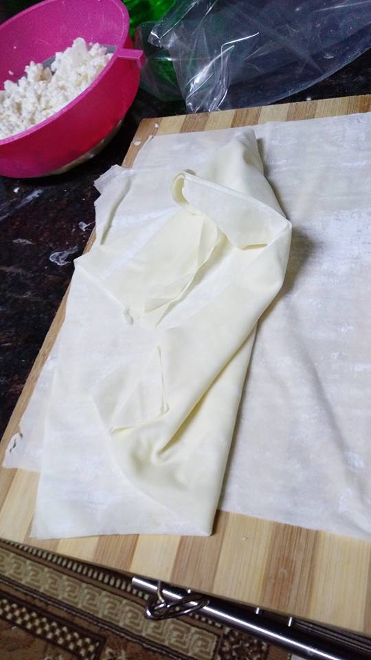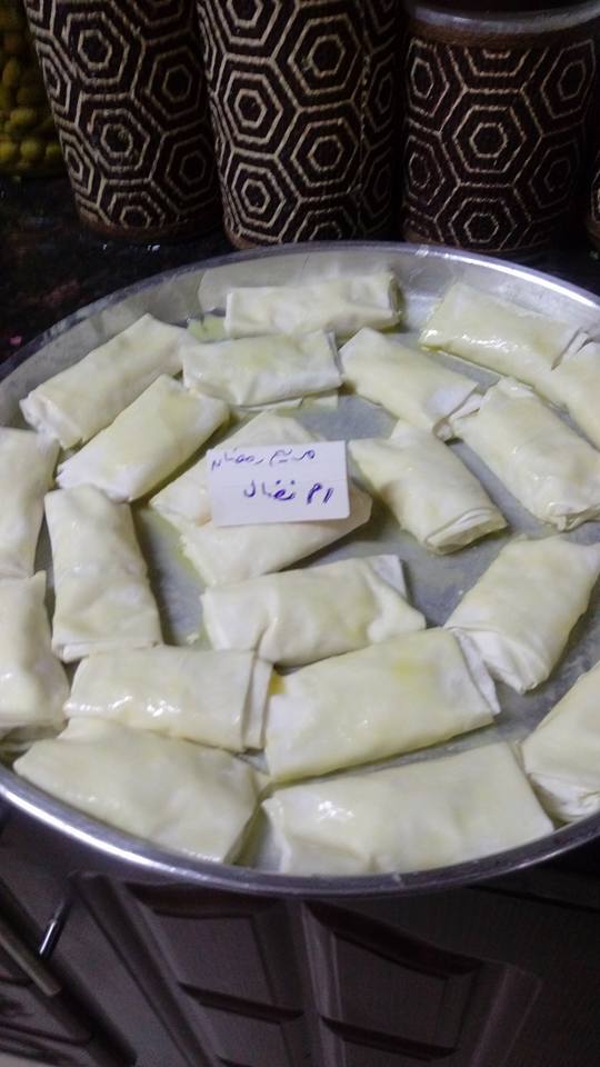 ونقوم بحشوها بالجبنة وقسم بجوز عين الجمل ونثنيها من الطرفين ونلفها ونصفها في صينية مدهونة بالسمن