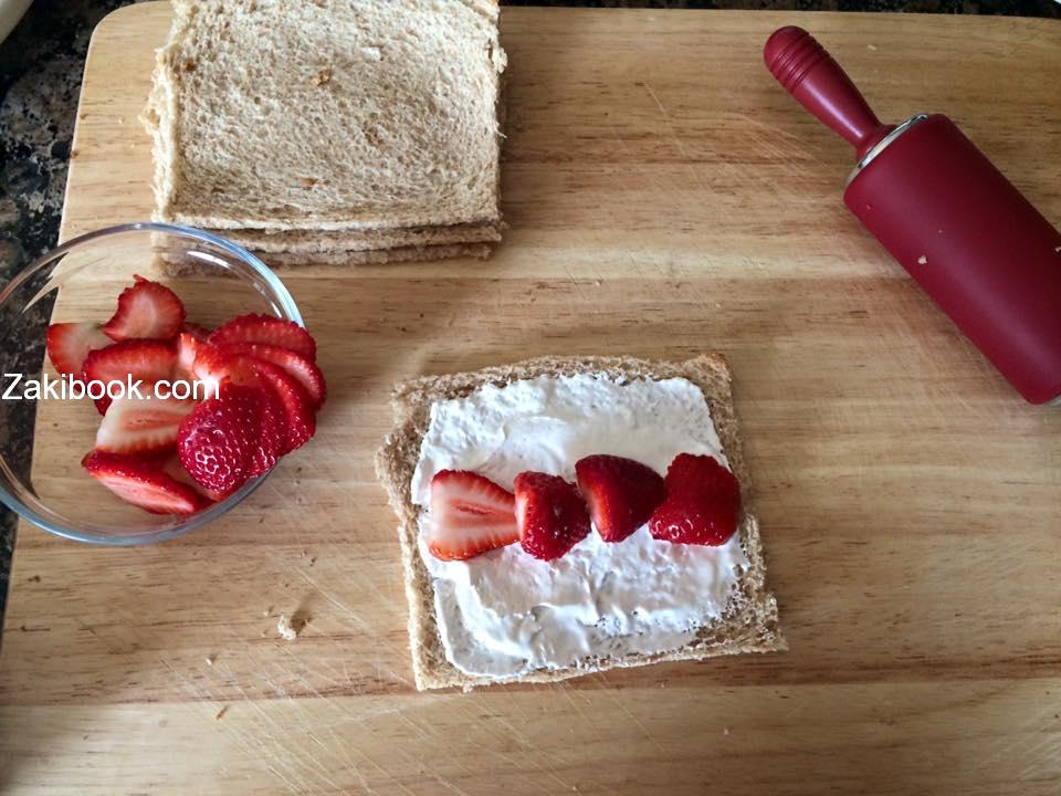– يمكنك وضع حشوة مكونة من الكريمة و الفراولة أو وضع الشكولاتة و قطع الفراولة ثم لفي الخبز.