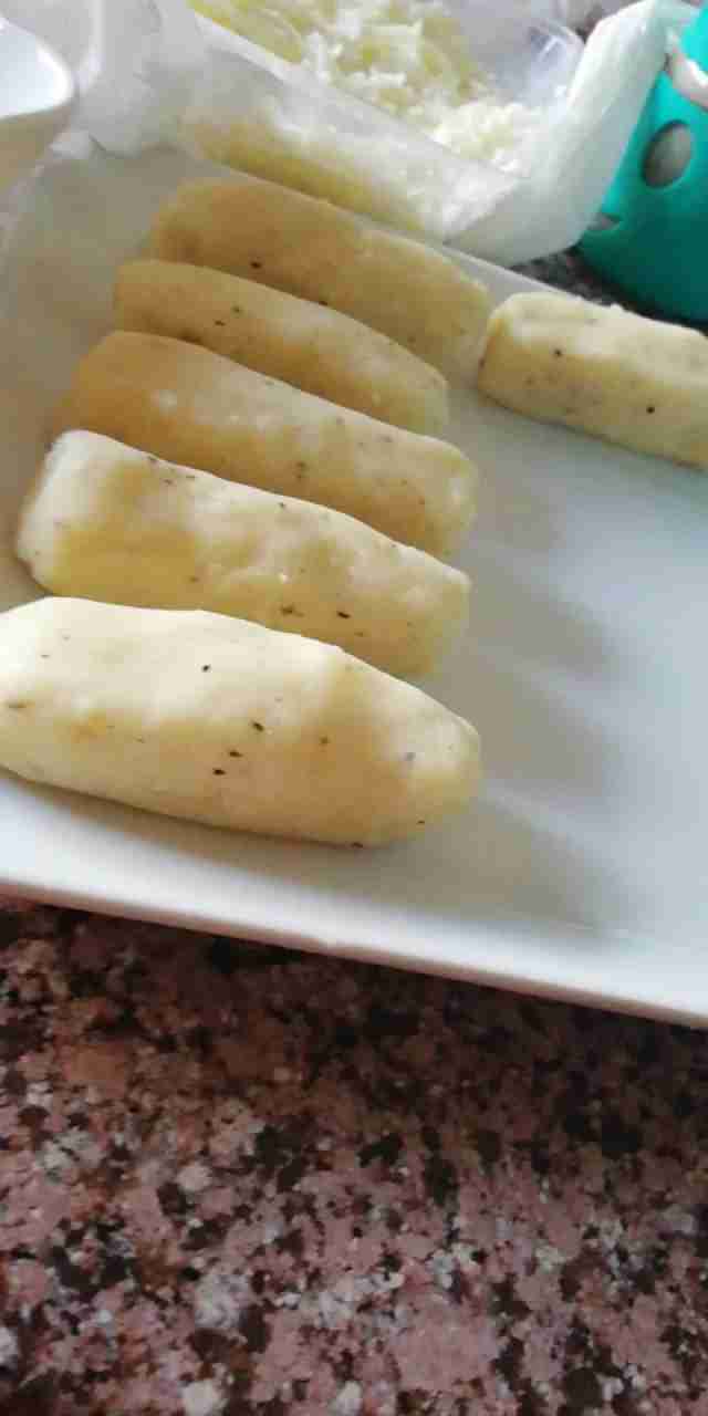 يتم سلق البطاطا وهرسها ووضع عليها الفلفل الاسود والملح ومكعب الزبده ورشة طحين وعجنها منيح وتكبيبها وحشوها بالجببن بهاد الشكل