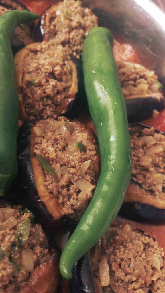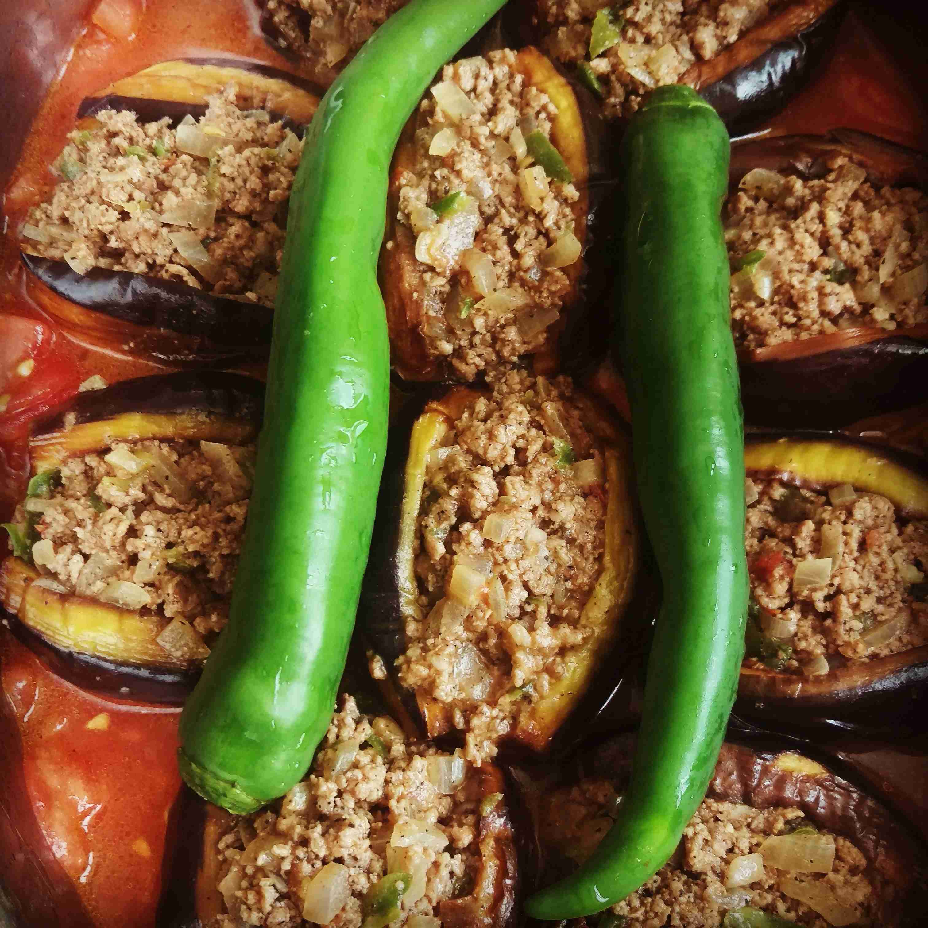 البندوره تقشر وتقطع وتوضع بطنجرة صغيرة مع القليل من السمن او الزيت حسب الرغبه وتطبخ لمدة عشر دقائق تقريبا ثم نقوم بوضع باسقل الصينيه جزء منها بعد ذلك. يحشى الباذنجان المقلي بخلطة اللحمه والبصل ويصف بالصينيه ثم يوضع باقي الصلصه المطبوخه فوقها وتزين بالفليفلة الخضراء وندخلها الفرن على اعلى درجة حراره من فوق ومن تحت حتى تشوى وتتعقد الصلصه منيح .. بامكانك ان تاكلليها مع الرز او غمس بالخبز