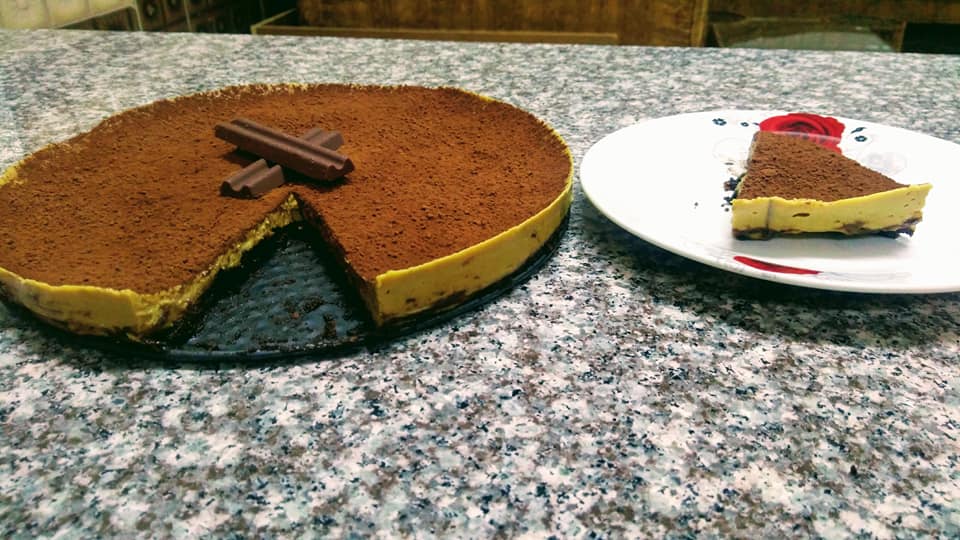 نقطع الكيك لنصين ونرصها بالصينيه ، وبالخلاط نحط قشطه ونسكافيه وبسكوت ماري ،