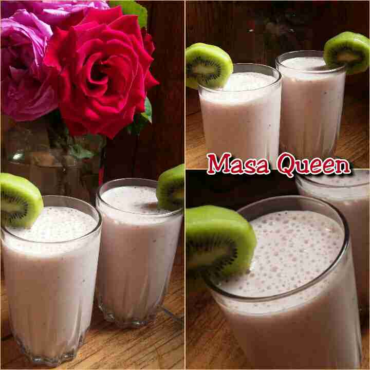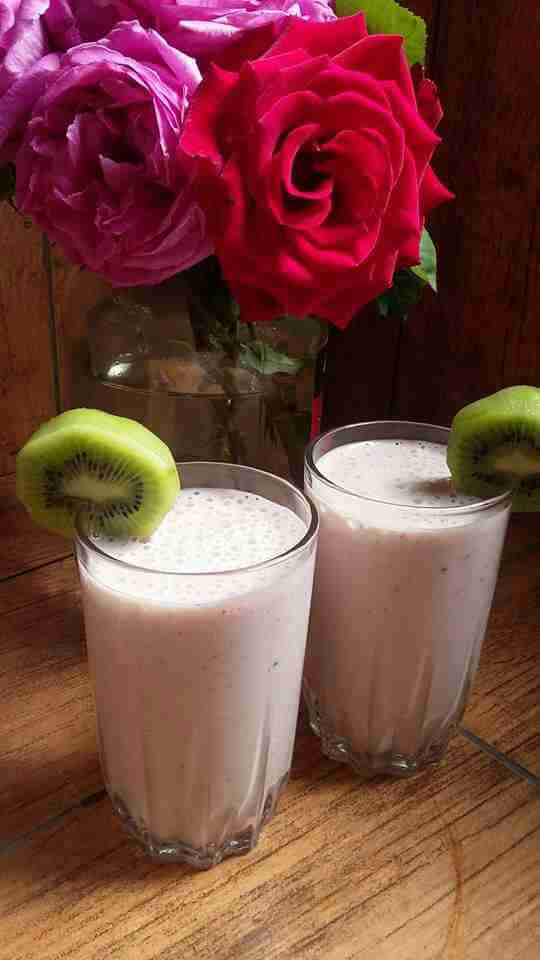 توضع قطع الموز والكيوي والفراولة المجمدة بالخلاط مع الحليب والسكر..