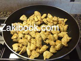 – على نار عالية نحمي مقلاة تيڤال ومن ثم يشوح بها صدر الدجاج لمدة ٥ دقايق او الى ان ينشف مائه يوضع على جنب.