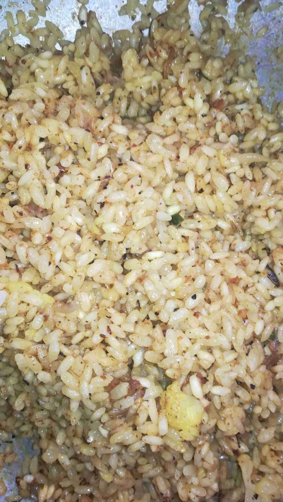 اول شي نقلي البصل والثوم وبعده نضع الحمه المفرومه الناعمه ونقليهم مع بعض وبعده نضع الأرز المنقوع وحبه الماجي ورشه البهارات ونخلطهم مع بعض ونرش رشه فلفل اسود
