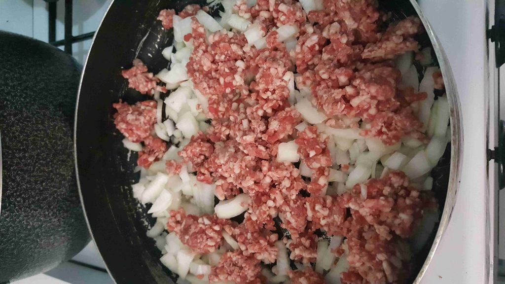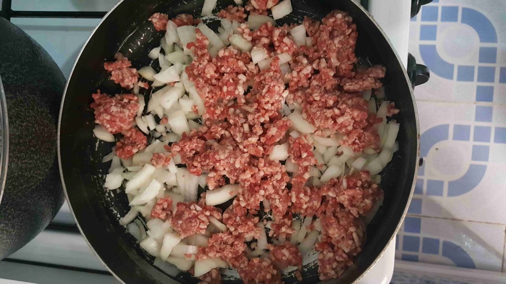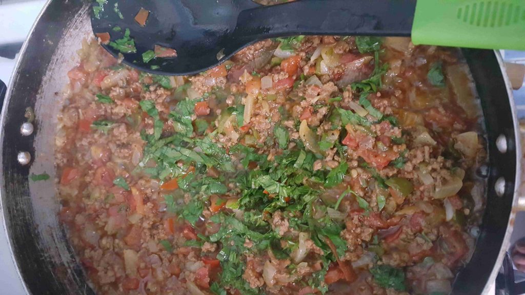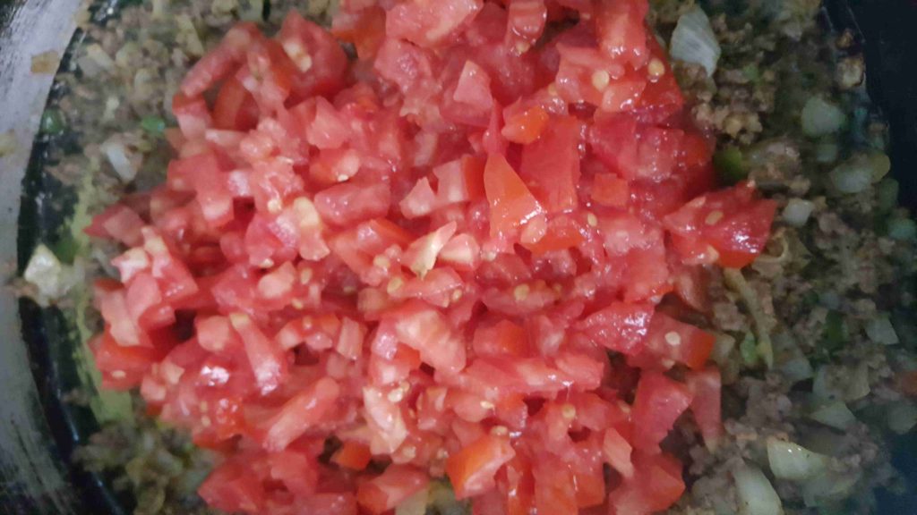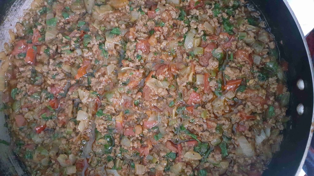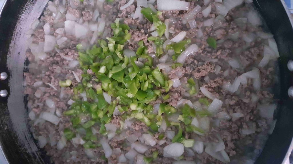 نضع القليل من الزيت و الحم على النار وبعده البصل والفلفل والطماطه والبقدونس والملح والبهار كما موضح في الصور