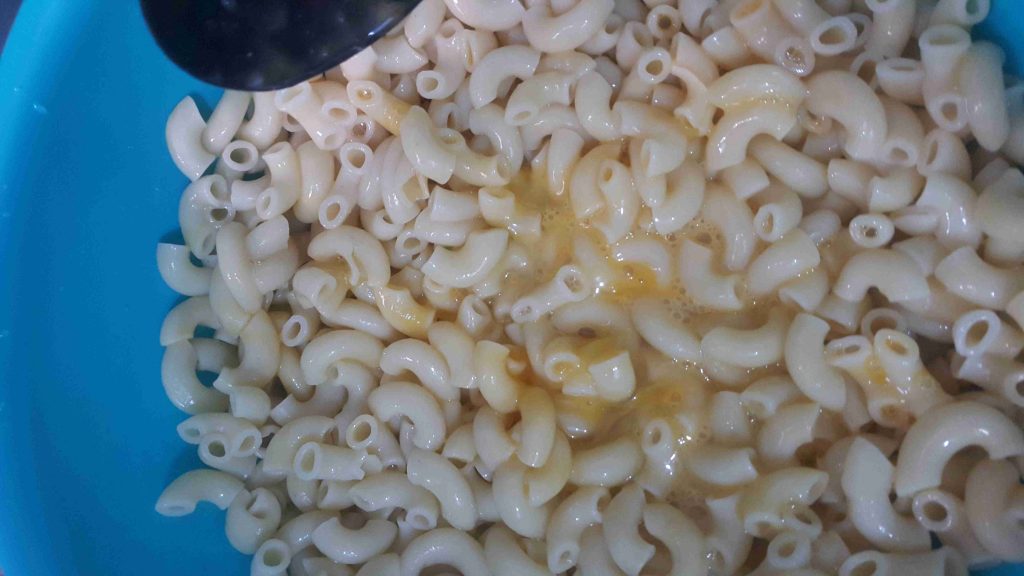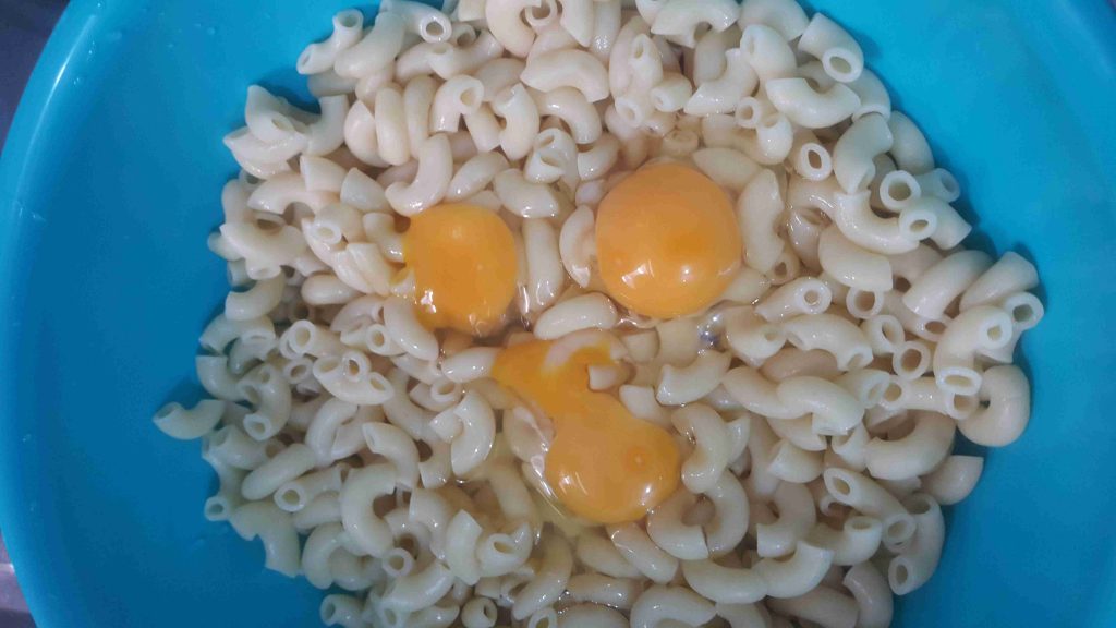 نضع ٣ بيضات عالمعكرونه المسلقه ورشة ملح ونخلطه جيد حتى يتجانس البيض ويختفي