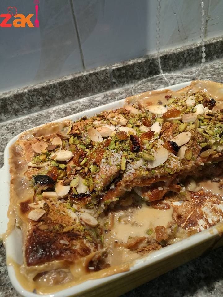 وبعدين رشيلك رشه مكسرات وبعدين بتشربيها من الصوص وبعدين رشة مسكرات وبعدين طبقة بسكويت كرواسان وبعدين شربيها بصوص وحطيها بالفرن يكون محمى مسبقا