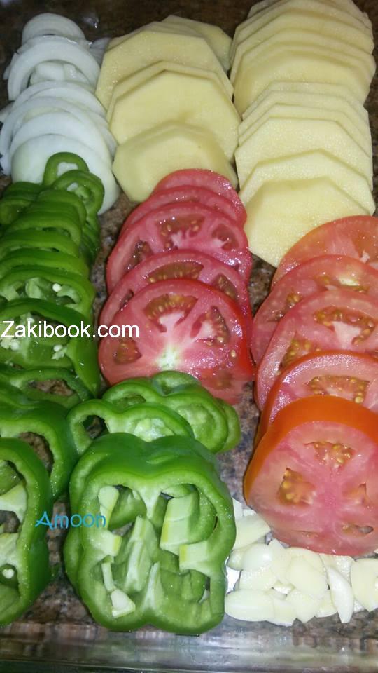 – نحتاج أيضا شرائح بصل وبندوره وبطاطا وثوم وفلفل حلو.