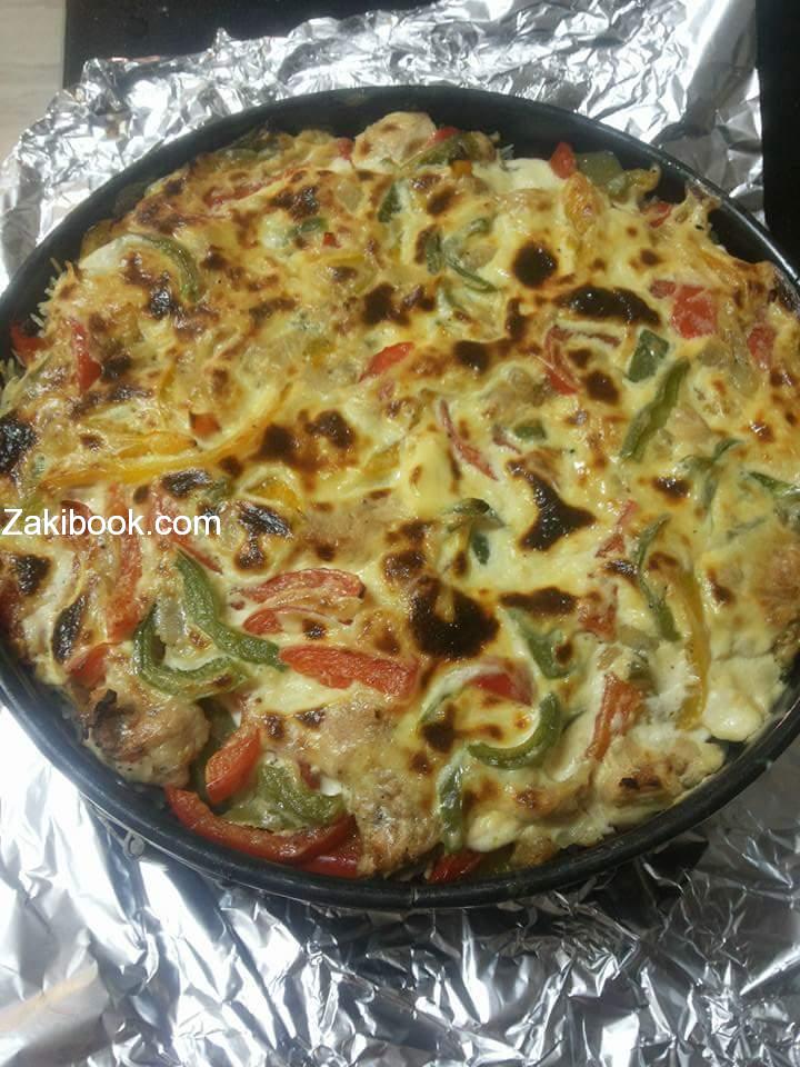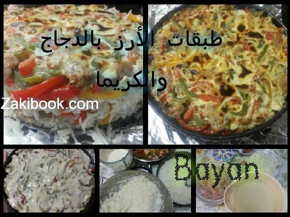 – في صينية نضع نصف كمية الأرز كطبقة أولى ..فوقها معلقة من خلطة القشطة …تضاف نصف كمية الدجاج والفلفل و معلقة خليط القشطة. ..ثم باقي الرز ونضيف باقي الدجاج.