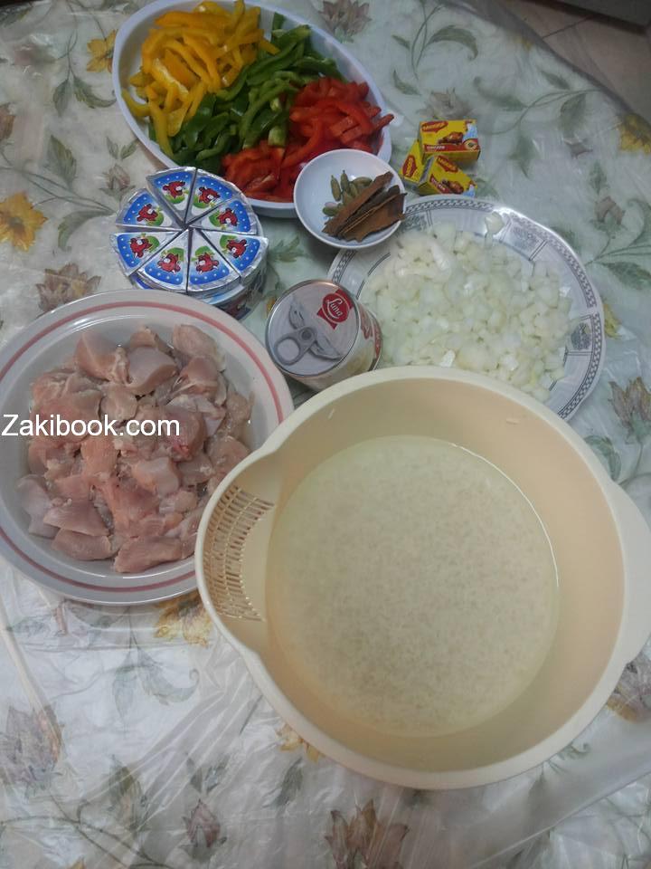 – نغلي ماء ونضع فيه الهيل الحب واعواد القرفة + 2 مكعب ماجي ونسلق الرز حتى الاستواء يصفى ويترك ليبرد.