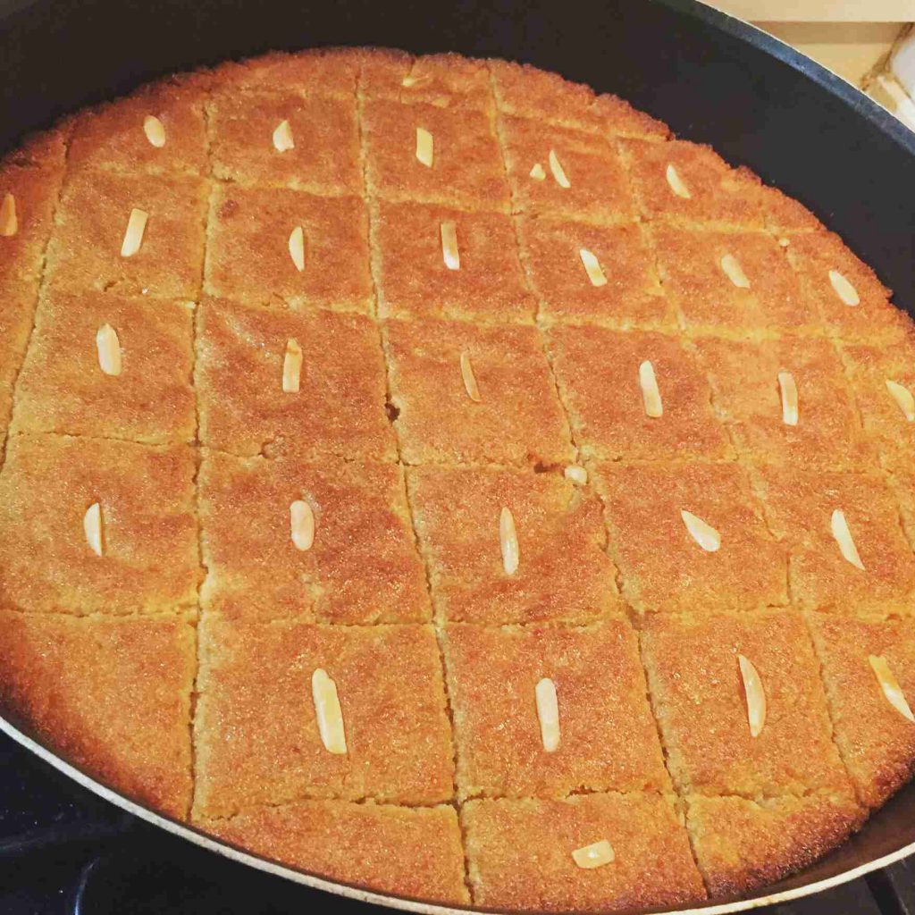 نضع السميد والسكر وجوز الهند في وعاء ونضيف البيكينج باودر. نذوب الزبده على نار هادئة لحين الذوبان ولكن حذاري ان تغلي نصبها فوق الخليط ونحرك ونصب كأس الحليب الدافئ ونحرك. ونفردها في صنية خبز متوسطة الحجم مدهونه بالزيت. نتركها ترتاح 7 دقائق ونقوم بتقطيعها الى مربعات كما بالصورة ونضع حبة لوز على كل مربع ونخبزها حتى تتفكفك اطرافها عن الصنيه وتتحمر من الاعلى والاسفل نعيد تقطيعها ونصب القطر ونتركها لترتاح وتتشرب القطر.