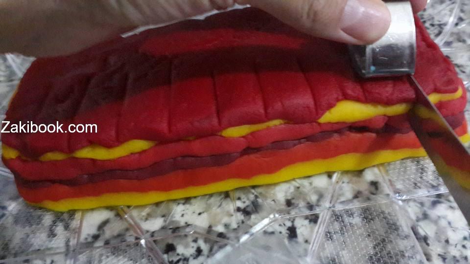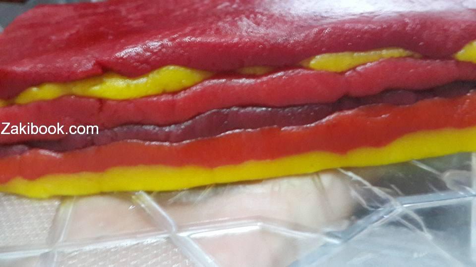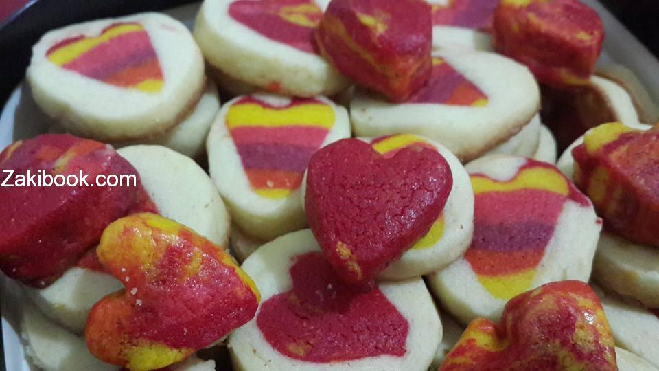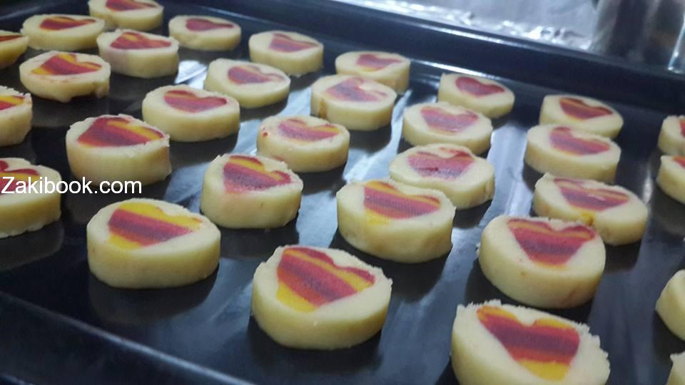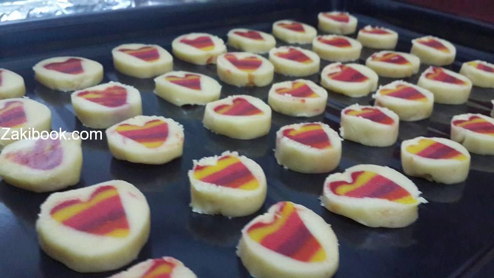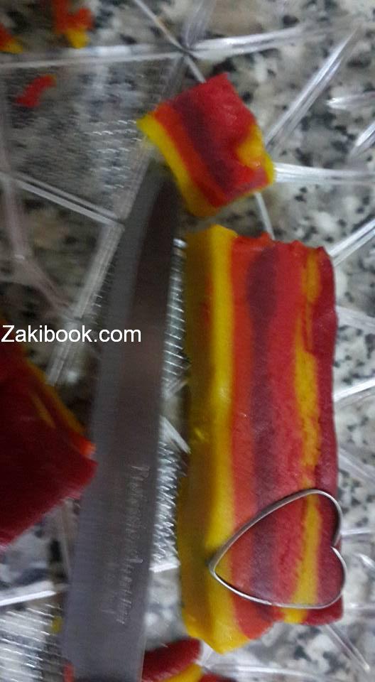– اقسمي الخليط الى قسمين قسم ابيض وقسم وضعت عليه الالوان ..وضعت الألوان فوق بعض ثم أقص القلوب بالقطاع الخاص بالقلب وبتلزقيهم ببعض بزلال البيض وحطيهم بالفريزة شوي ورجعت لفيت القسم الأبيض عليهن وقطعتهموبتخبزيه  بالفرن.