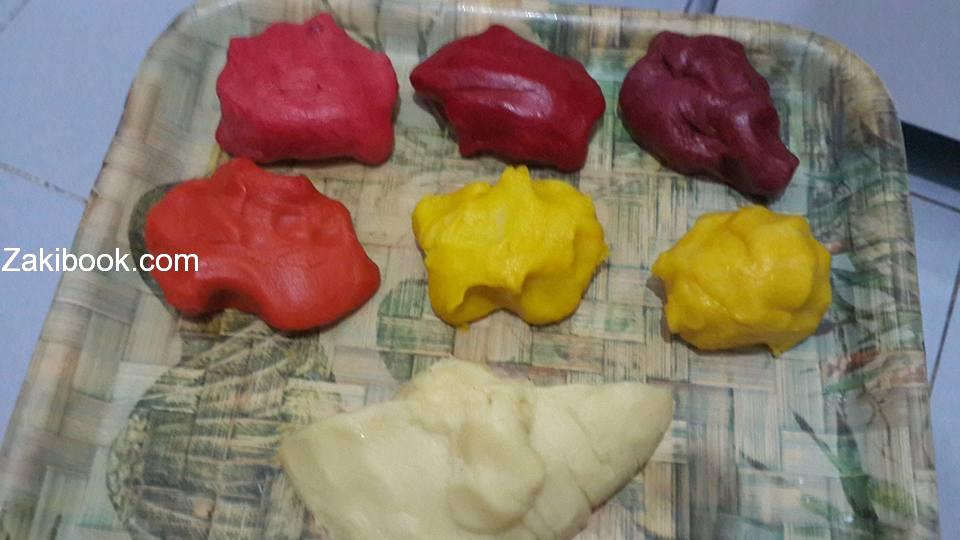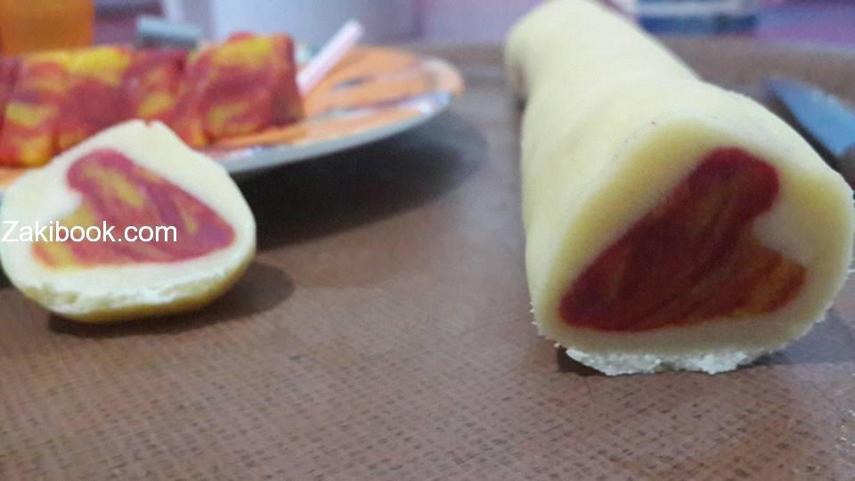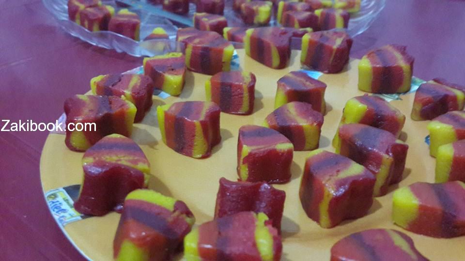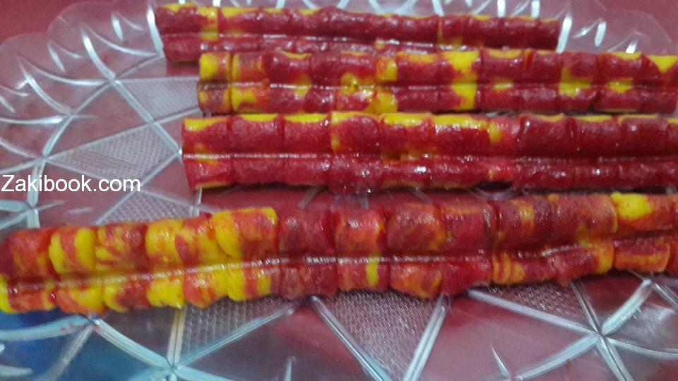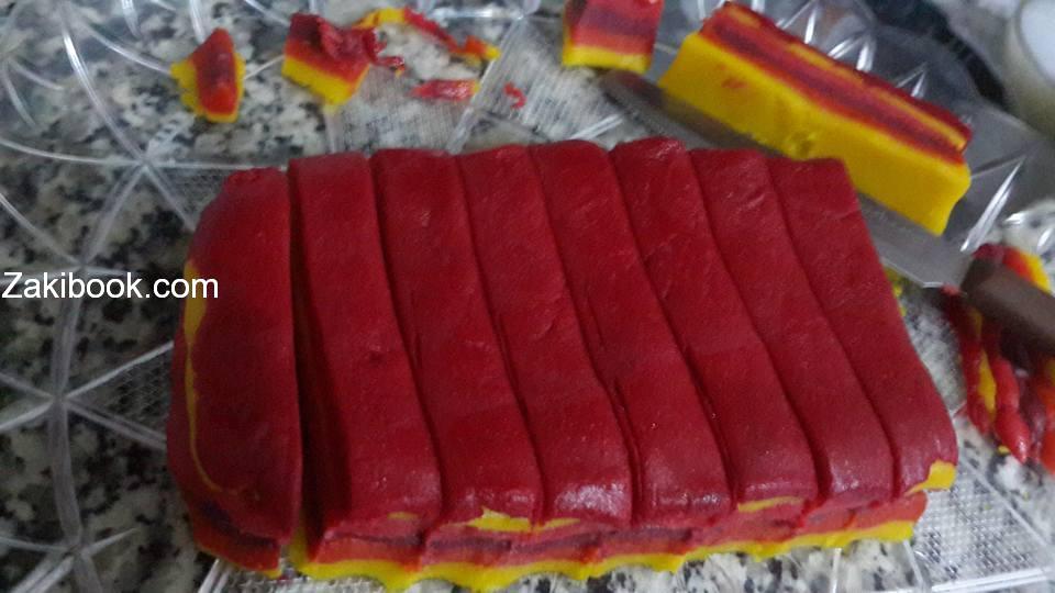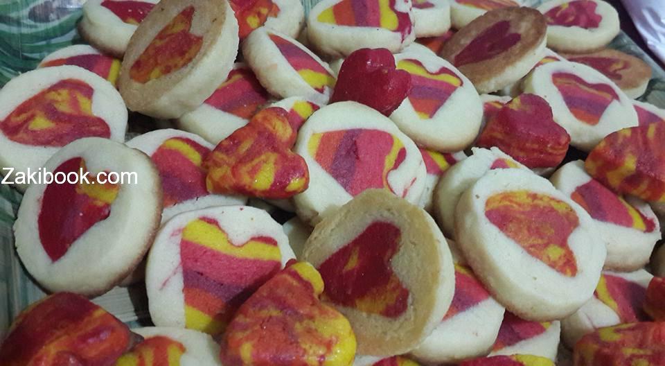– اقسمي الخليط الى قسمين قسم ابيض وقسم وضعت عليه الالوان ..وضعت الألوان فوق بعض ثم أقص القلوب بالقطاع الخاص بالقلب وبتلزقيهم ببعض بزلال البيض وحطيهم بالفريزة شوي ورجعت لفيت القسم الأبيض عليهن وقطعتهموبتخبزيه  بالفرن.