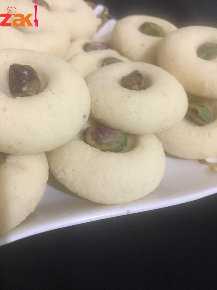 يخلط السكر مع السمن ويحرك جيدا حتى يتجانس يضاف الطحين بالتدريج يضاف السميد وتخلط باليد من تحت لفوق توضع بالثلاجة 6 ساعات ويفضل ليلة كاملة