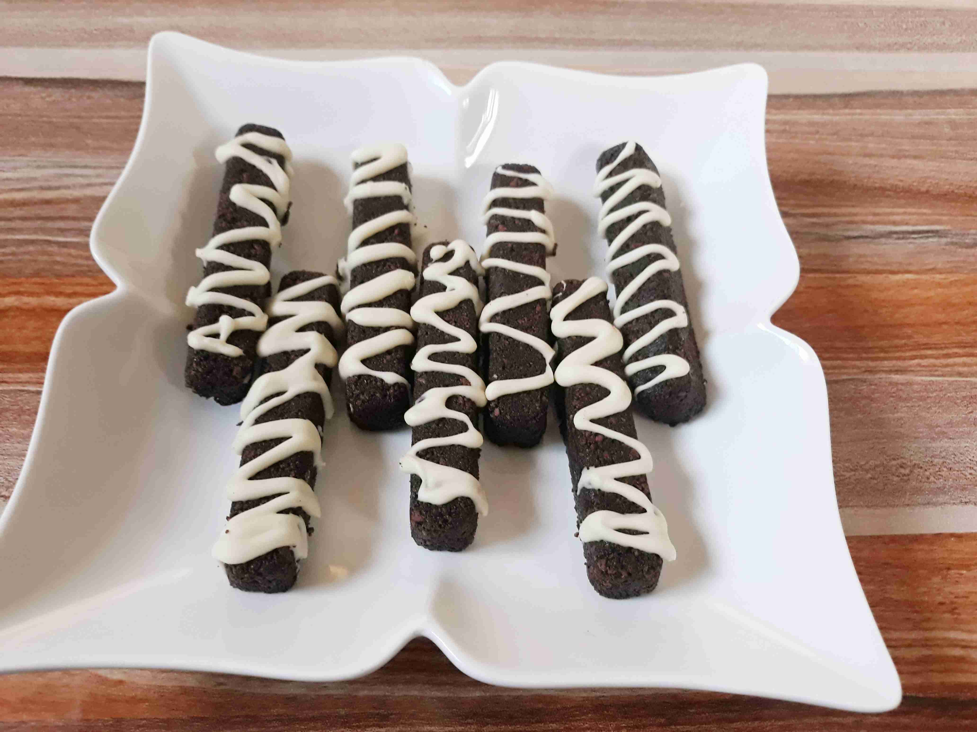 بنضع بمحضره الطعام البسكوت والزبده والعسل او القطر والكاكاو وبنطحنهن لما يختلطو منيح وبنشكلهم بقوالب الثلج او قوالب الشوكولاه او اي شكل بنفضلو وبنحطهم بالفيزر اربع ساعات يتماسكو وبنزينهم بشوكولاه بيضه بنسيحها على حمام مائي وبنعمل خطوط على اصابع البسكوت وبنرجعهم على الثلاجه يجمدو وتقدم