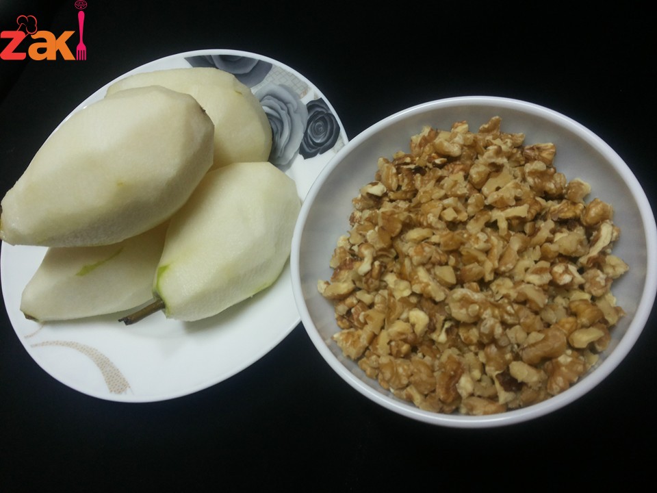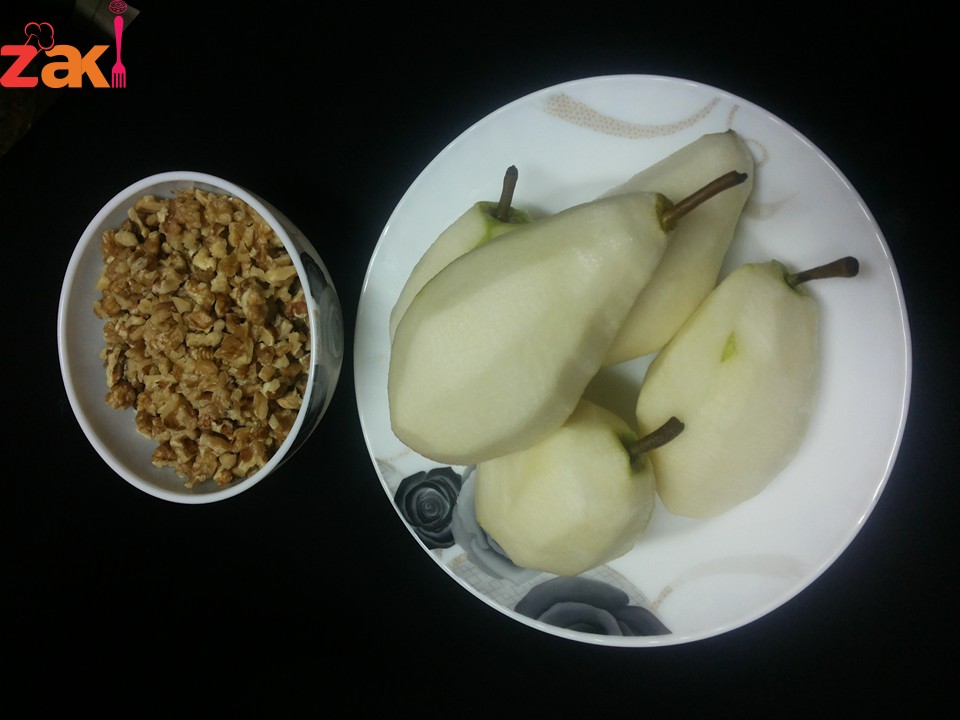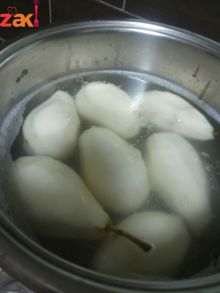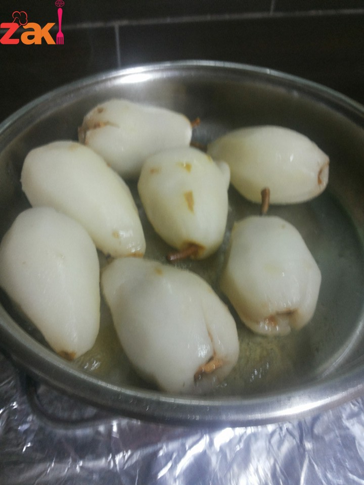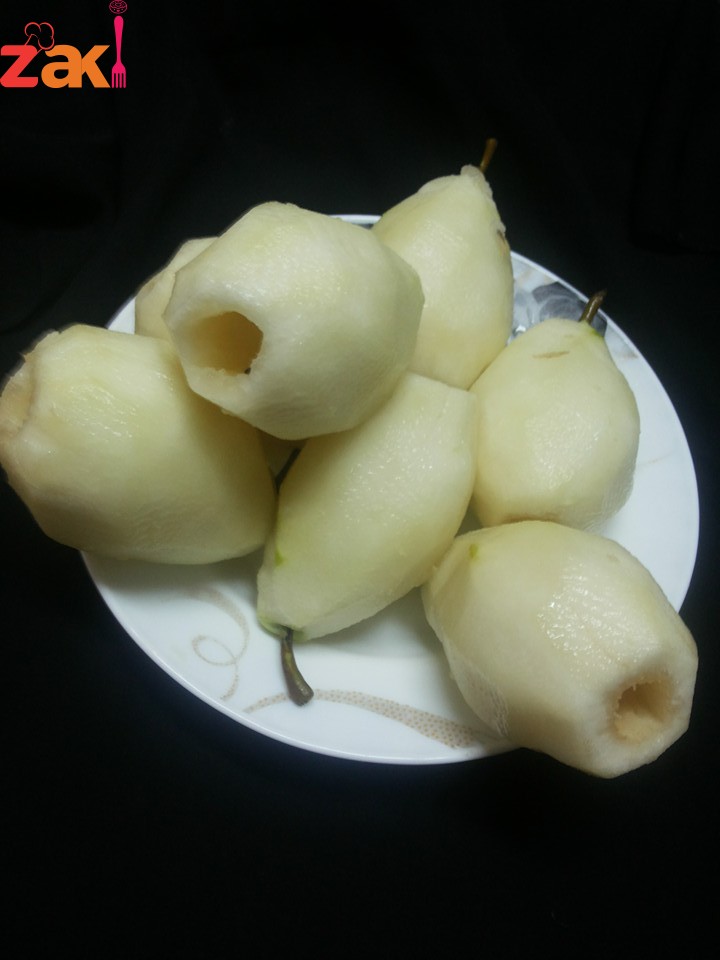 يقشر الإجاص مع ابقاء العرق العلوي ويدهن بالليمون للمحافظة ع اللون