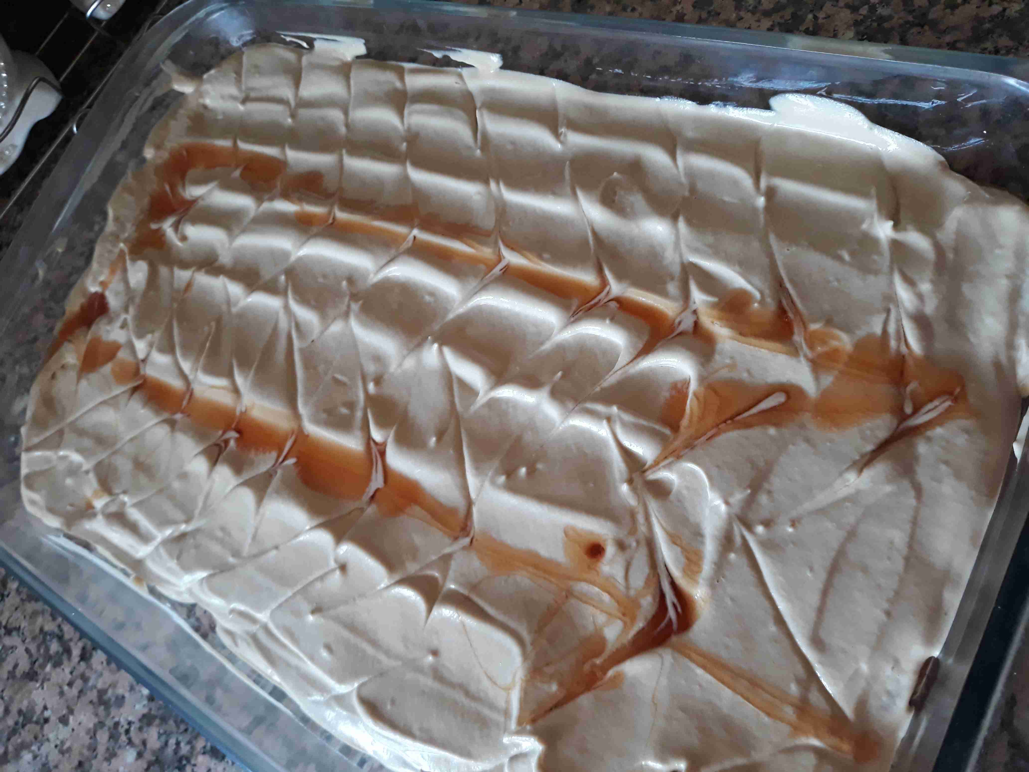 ١. نذوب ملعقتين من النسكافيه في الحليب السائل ثم نضيف مغلفين الكريمة ونخفق جيدا الى ان تصبح كريمة ثم نضيف علبة القشطة ونخفق لمدة دقيقتين ثم نضعها في الثلاجة لمدة عشر دقائق