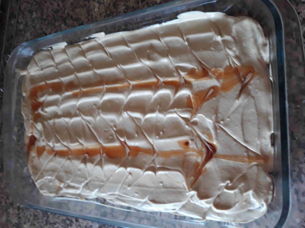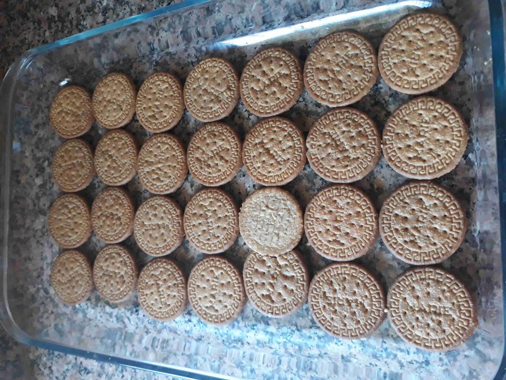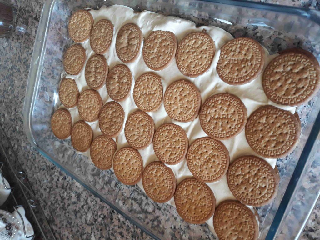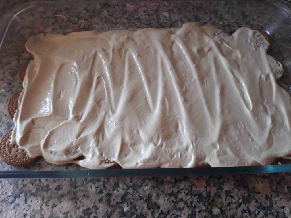 ٣. نضع طبقة من البسكويت المغمس بالنسكافيه ثم طبقة من الكريمة وهكذا حتى نفاذ الكمية