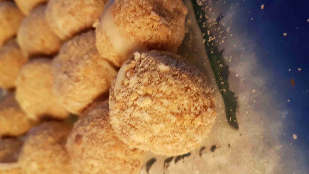توضع في إناء وخلطها مع الحليب المكثف وبعدها تشكيلها كور وتغلف بالبسكوت المطحون