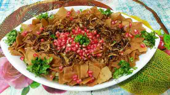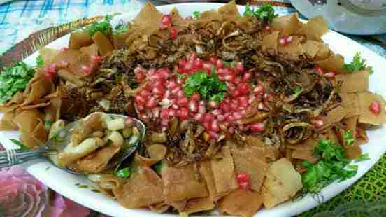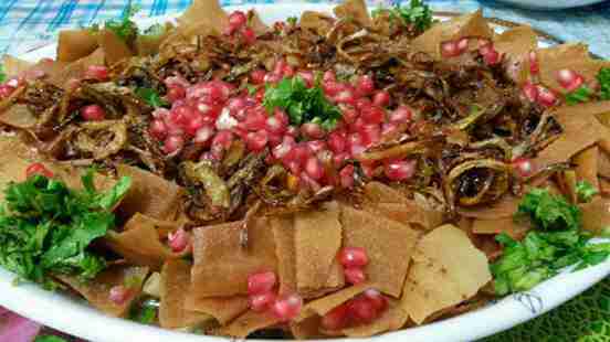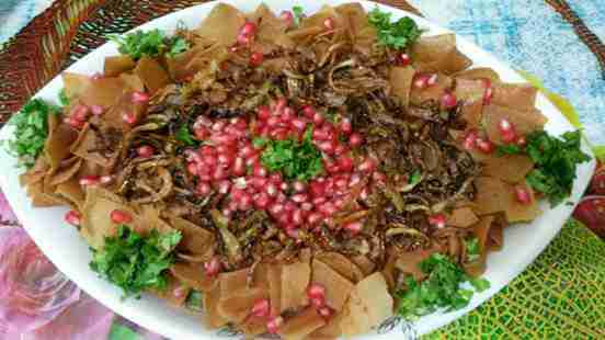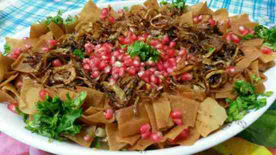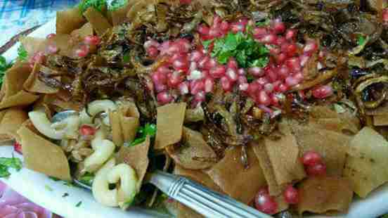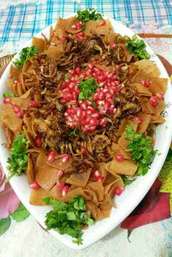 وأول ماتغلي ننزل المعكرونة فوقهم ونتركها مدة 10 دقائق لتستوي ثم نرش رشة كزبرة خضراء ونقلب تقليبتين وتسكب وتزين بالخبز والبصل المقلي والكزبرة الخضراء والرمان