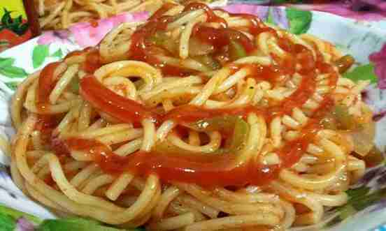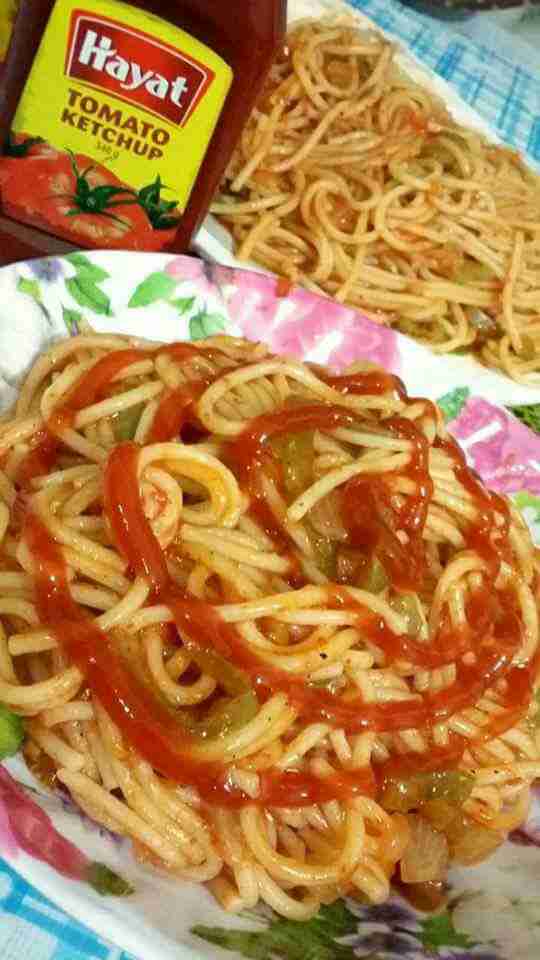 كل حزمة سباكيتي تحتاج نصف طنجرة وسط ماء و نضيف رب البندورة (معجون الطماطم) وملح وفلفل وفليفلة خضراء جوانح