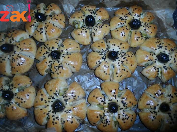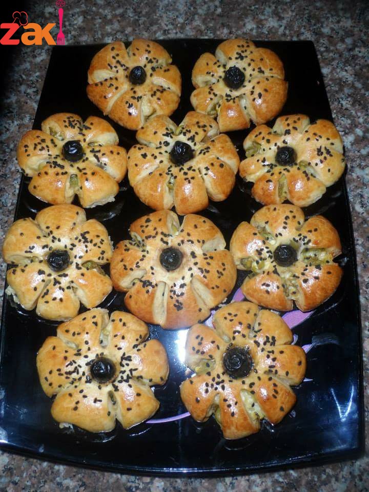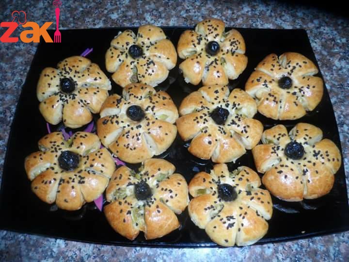 نقوم بخلط كل مقادير نسبق بسوائل ثم نبدا باضافة الطحين شيئا فشيء حتى نتحصل على عجين طري ومتماسك لايلتسق باليدين نشكل كرات صغيرة ثم نحشوها وبعدها نقوم بتشكيله على شكل وردات بالاستعمال المقص كما يظهر بصورة ثم نقوم بطلي الوجه بصفار البيض وندخلها الفرن تستوي