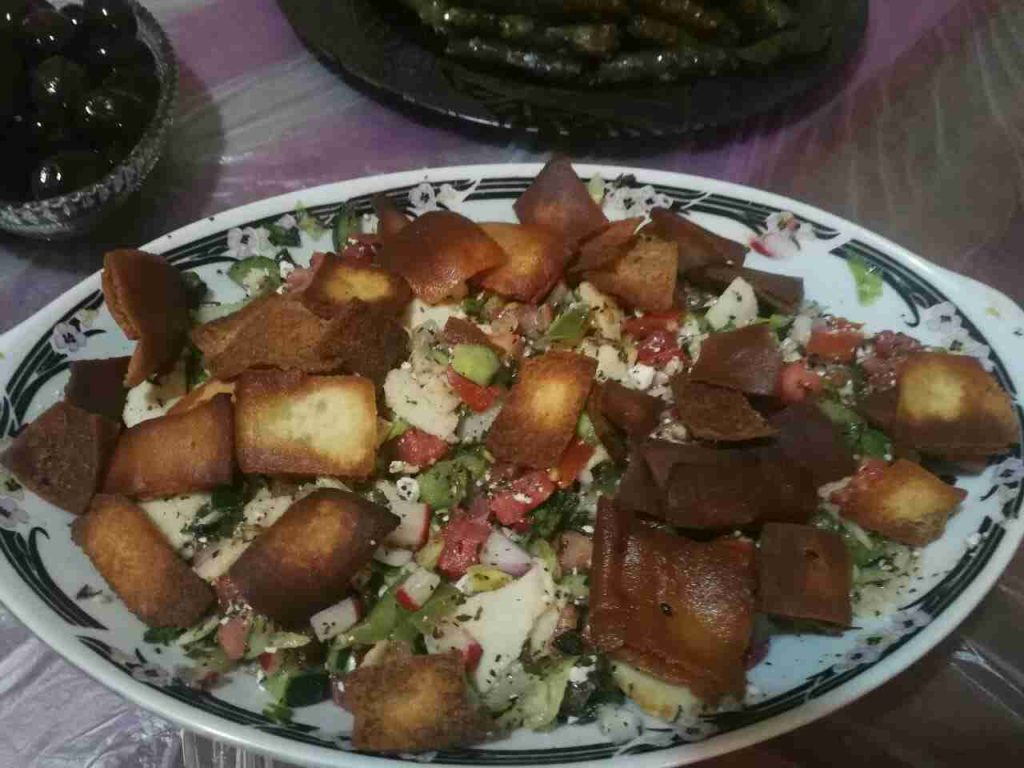 نقع البرغل نصف ساعه نزيل الماء عنه نضع الزيت وعصير الليمون ثم نفرم البقدونس والنعنع والبصل فرم ناعم ونضعهم فوق البرغل ونضع الملح ونخلطهم جيدا ونضعهم في جاط التقديم ونزينه باوراق الخس والليمون وطربقة الفتوس نقلي الخبز ونضعه بجاط ونقطع البندوره والفجل والخيار والبصل والنعنع والخس والفلفل الحلو والحار ونضعهم فوق الخبز ونض الملح وعصير الليمون والخل وشوية جبنه على الوجه طيب كتير