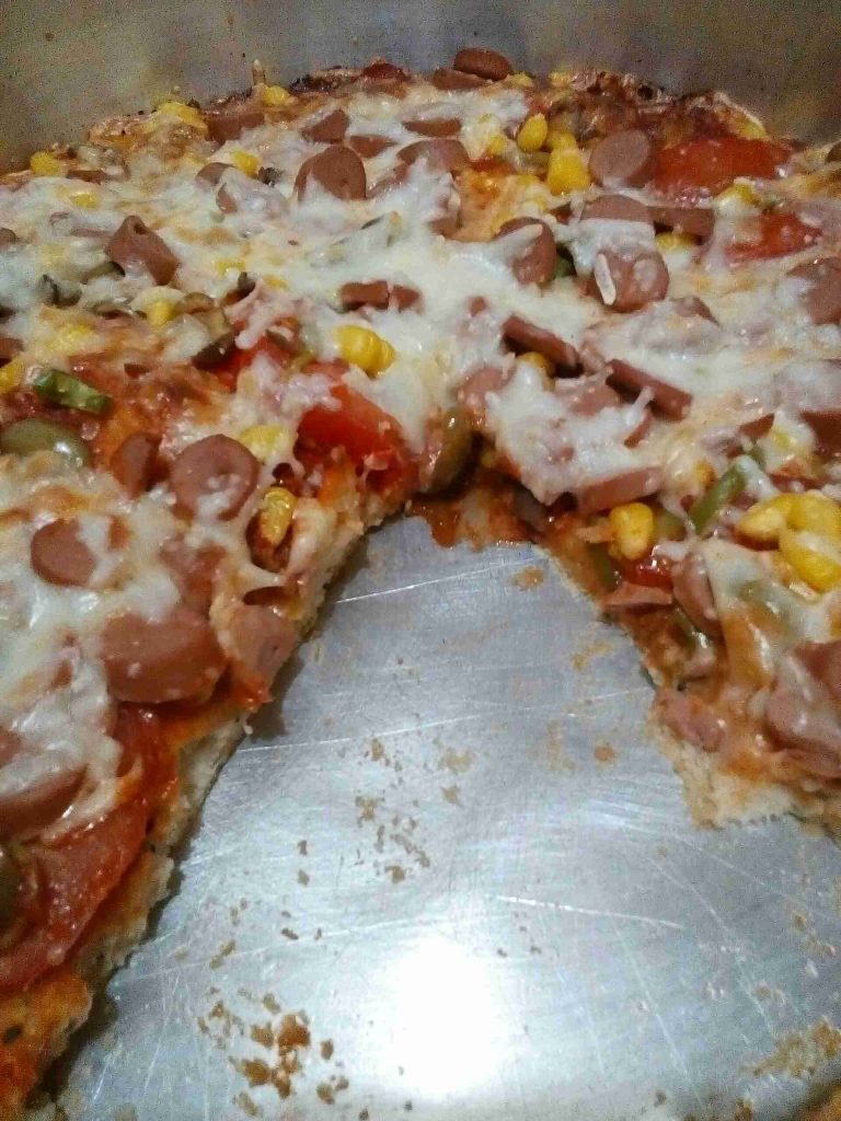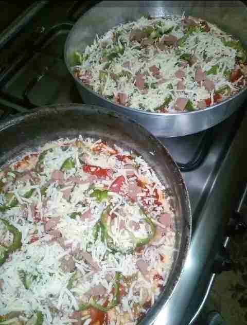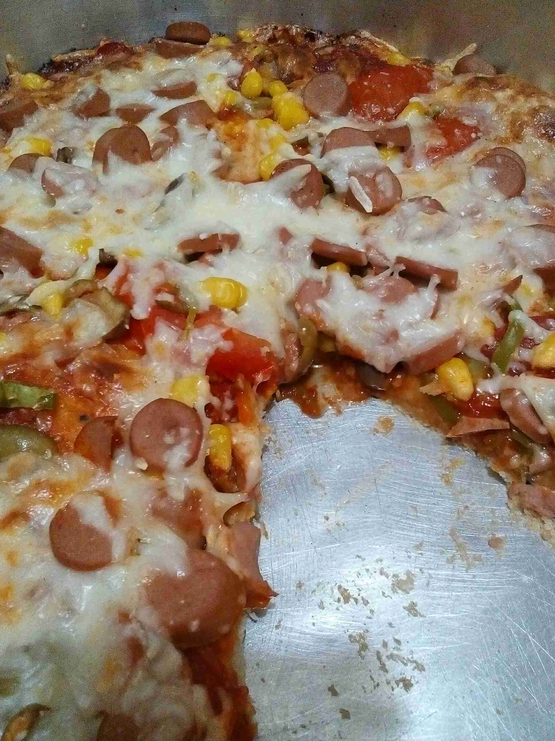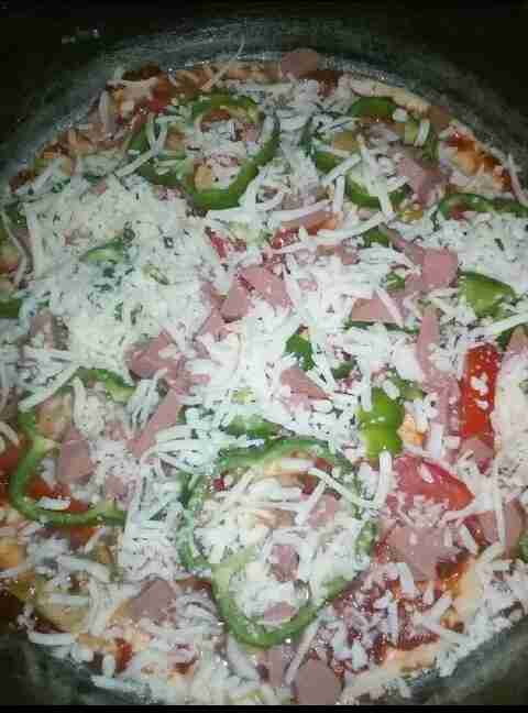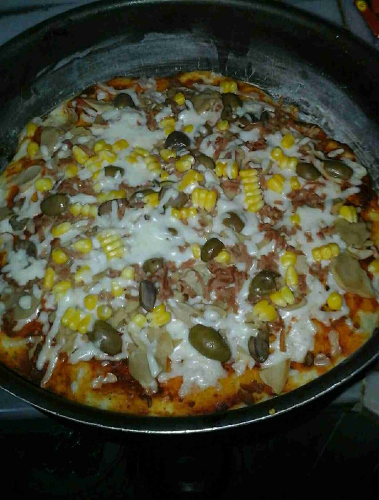 بفرد العجينة وبدهن صينية بالزيت وبحط العجينة بالصينية وبدهنها بالصلصة وبحط شرايح البندورة وشرايح الفلفل والمرتديلا واذا بتحبو ذرة والزيتون وبرش عالوجه الجبنة وبدخلها الفرن نص ساعه عالواطي وبحمرها