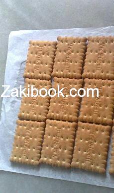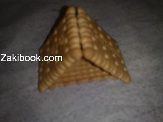 – يوضع على قصدير ويصف بهذه الطريقة واضعي طبقتين من البسكويت لتحافظ على الشكل الهرمي.