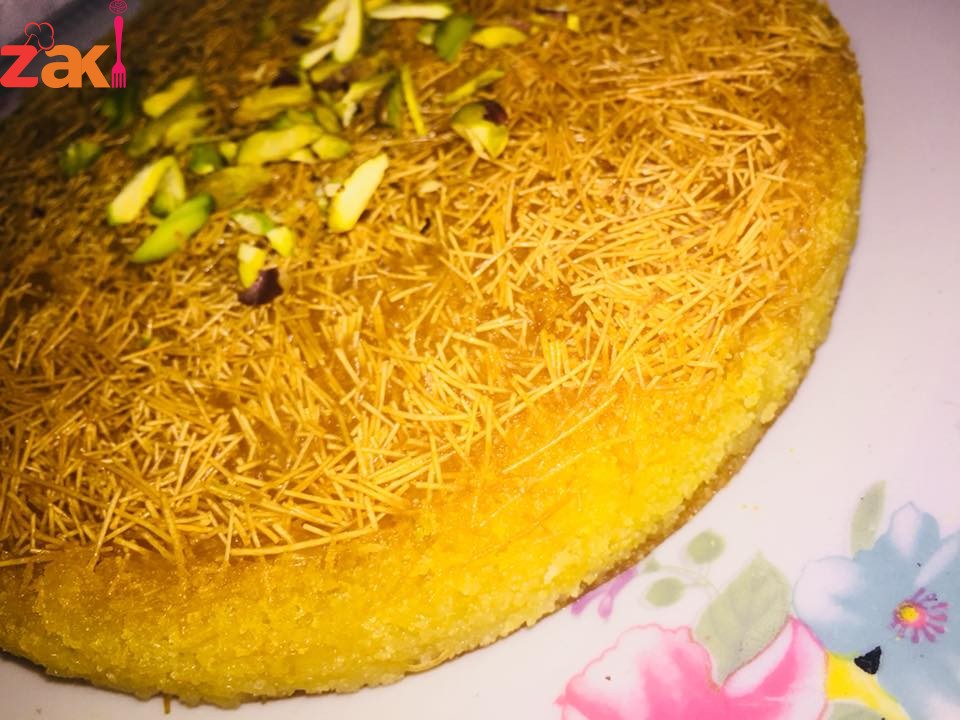 هنا عملت الها طبقة من الشعرية الباكستانية تحتها يعني دهنت الصنية زيت اكويس وبعدين كسرت الشعرية تكسير وسط وبعدها صبية البسبوسة عليها ولمن خبزتها قلبتها وسقيتها بالقطر ورجعت غطيتها بنفس الصنية منشان تتشرب اشوي