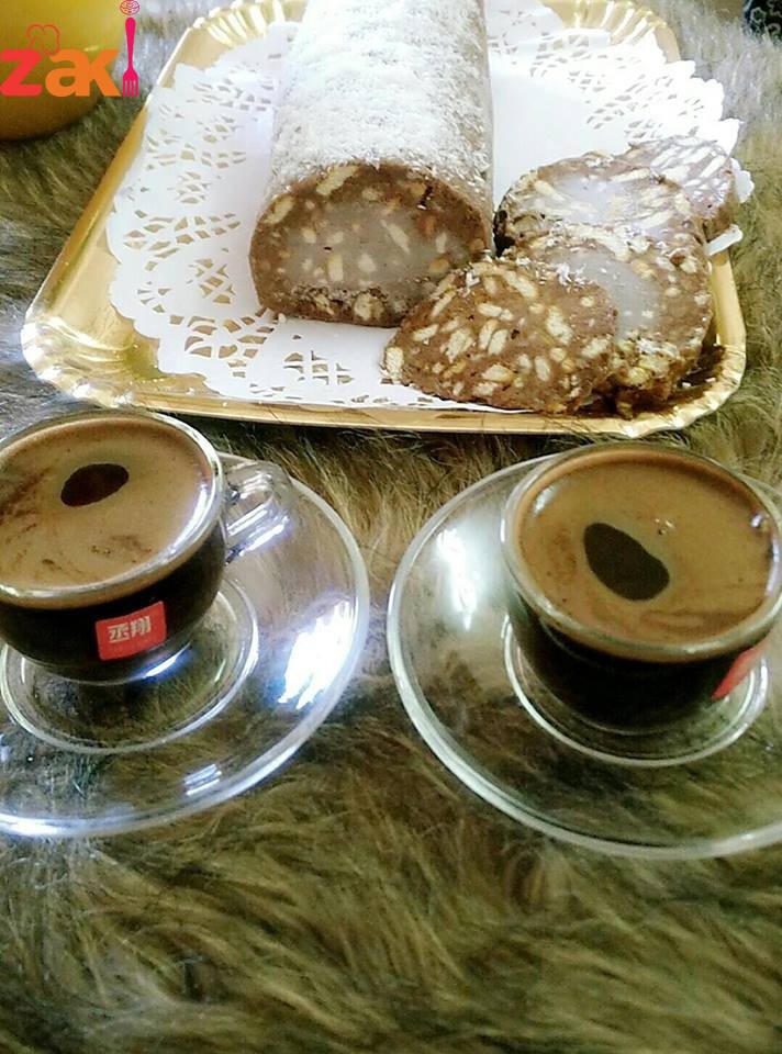 يفتفت البسكوت ويوضع بوعاء ويتم اضافة الخليط عليه ويتم تحريكه ويصب على نايلون ويتم لف النايلون عليه ويوضع بالفريز لمدة ٥ ساعات وتقطع وتقدم باردة مع القهوة