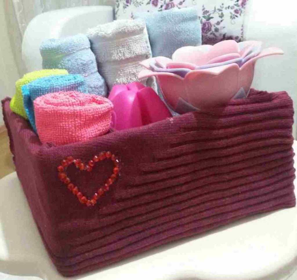 - وبستخدم قماش لاي كنزة او قميص او بنطلون قديم عندكم او مشقوق ومابقى بدكم ياه مو ضروري تحولوه لممسحة ههههههه لبسو فيه الكرتونة المذكورة لتحصلو على علبة تضبو فيها غراض وترتبوهم متل ما انا عملت وبدون اي تكلفة عدا كلفة التلزيق البسيطة هههه انا بستخدم اعواد السيليكون وبقص القماش حسب حجم الكرتونة وبلزقو عكيفي..