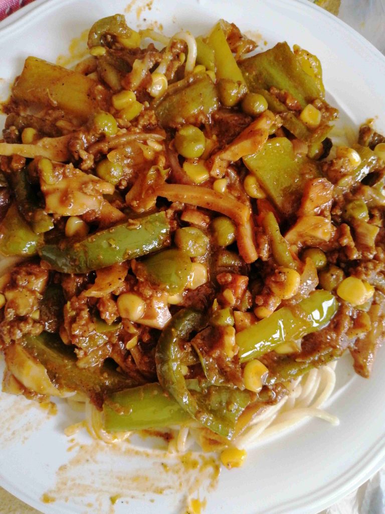 في طنجره على الغاز نضع الزيت الزيتون وزيت مازولا ونضيف البصل والثوم ويحرك قليلا حتى تذبل ثم نضيف اللحمه المفرومه ونحرك المزيج ونتركه مده 5 دقائق ثم الفطر والجزر ونحرك المزيج جيدا مع اضافه كوب الماء والملح وجميع البهارات ونحرك المزيج جيدا ونتركه مده 5 دقائق ثم نضيف البازيلاء والفلفل البارد والحار والذره ونحرك المزيج ونتركه مده 5 اخرى