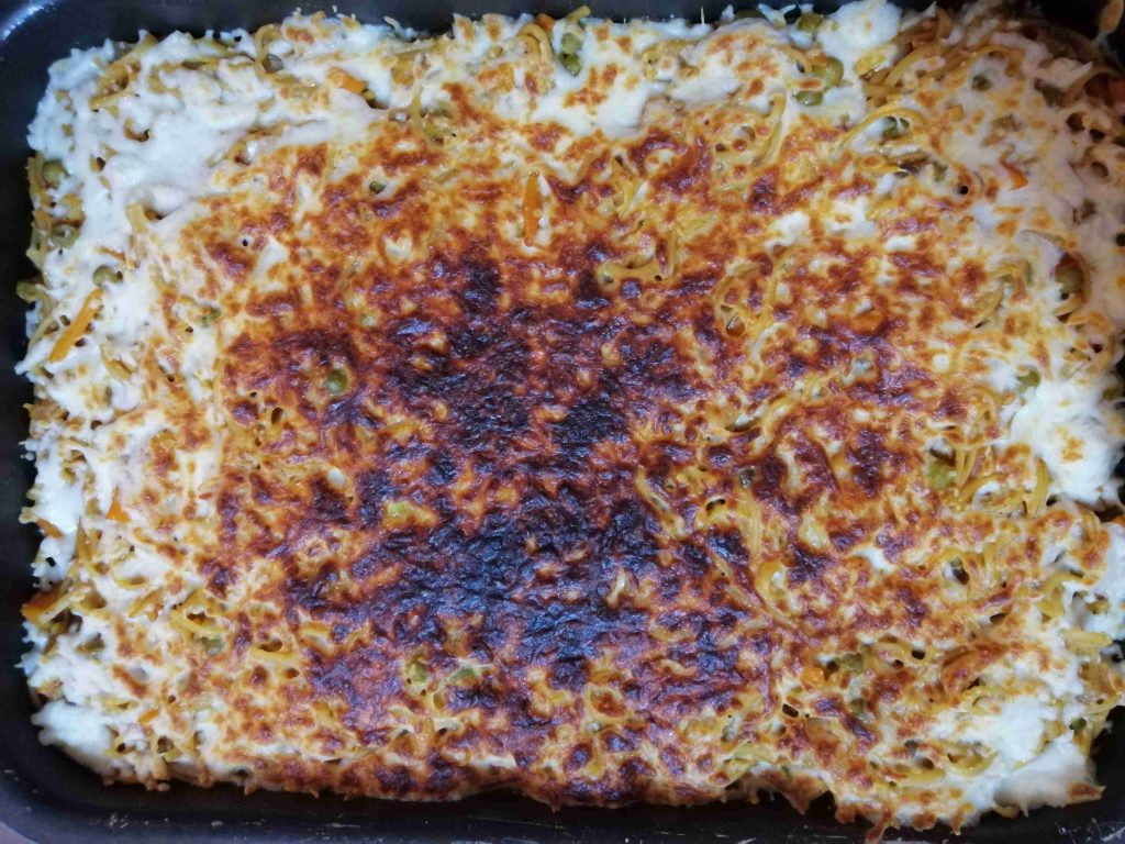 ثم تسكب في طبق التقديم ونضع عليها جبنة الموزيلاريا حتى تغطي الوجه كامل ثم ندخلها إلى الفرن المحماه سابقا حتى تتحمر من الاعلى