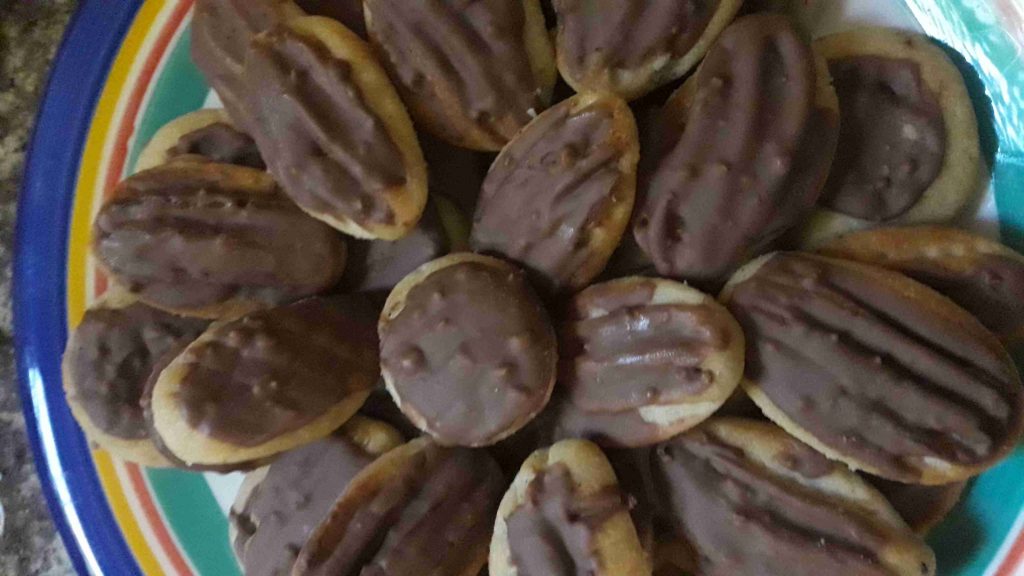 السلام ورحمة الله وبركاته كيفكم يا عسولات زاكيي شتقتلكمم كتيررر .. اول شي بنخفق زيت وسكر مع بعض مع الفانيلا بعدين بنحط نشا وبنخفق بعدين الطحين تا تتكون عجينه ملسه وطريه ان بدنا لون بني نحط معلقه كاكاو مع العجينه بشكلهن بخبزهن بفرن على حرارة ١٥٠ بس يتنشفو ويتحمرو من تحت بنزلهن شوي على شوايه بجيب كراميل بحشي بقلبها بحط على ذيال جوز الهند القسم تاني بجبب شكلاته سادة بسيحها على حمام مائي بحط معلقه زيت ببلش اغطس البسكوت في صحه وهنا يارب