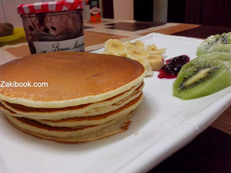 في وعاء الخلاط تخلط جميع المكونات معا مدة دقيقتين. في مقلاة على النار ندهن القليل من الزبدة ويوضع في وسط المقلاة مقدار مغرفة من خليط البان كيك يترك على نار خفيفة حتى يبدأ ظهور الفقاعات وسط الخليط ثم يقلب على الجهة الأخرى ليحمر قليلا ويرفع تكرر الطريقة لباقي الكمية.