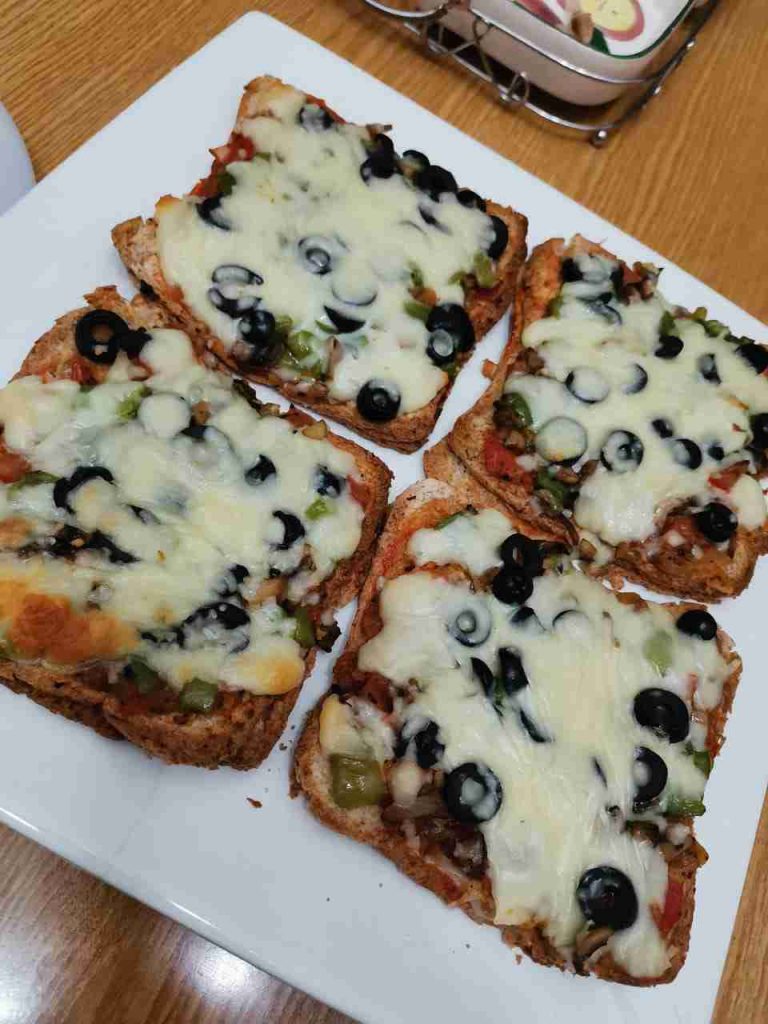 خبز التست بترقي كل وحده بالشوبك وبتحطي تنتين مرقوقين فوق بعض وبين كل حبه بتحطي كتشب وشوية موزيريلا