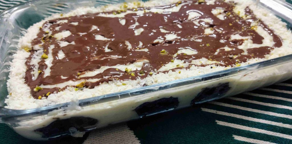 لحتا يثقل الخليط بنضيف ملعقة صغيرة فانيلا وبنحكرهن وبنزل الخليط ساخن على حبات البسكويت لحتا نغطي حبات البسكويت وبنتركو يبرد ملاحظة اذا بتحبو الكريمة بنكهة الشوكلاته ممكن تضيفو ملعقة كاكاو بودرة ملاحضة ثانية الخليط بضل قوامو كريمي حتا لو دخلناها الثلاجة قوام الطحين بالكريمة بختلف عن قوام النشا قوامها بكون متماسك أكثر وبس تبرد الكريمة بنزينها برشة جوز الهند والفستق الحلبي وممكن نزينها بالفواكه حسب الرغبة وزادت ملعقتين من الكريمة ضفت عليها ملعقة صغيرة كاكاو ذوبتها بملعقة صغيرة ماء مغلي وضفتها عالكريمة وزينت بيها الوجه بس انا لانو الكريمة كانت سخنة شوي ذابت معي بسبب ولادي مارح يتركوها تبرد وقوامها يتماسك اكثروان شالله تعجبكم وصحة وهنا يارب