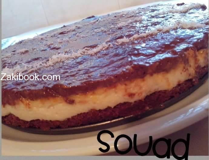 نضع الكيك في صينية التشيز كيك ثم نضع فوقه خليط الطبقة الثانية ثم نضع بحذر الطبقة الثالثة وندخله البراد ليتماسك. صحة وهنا