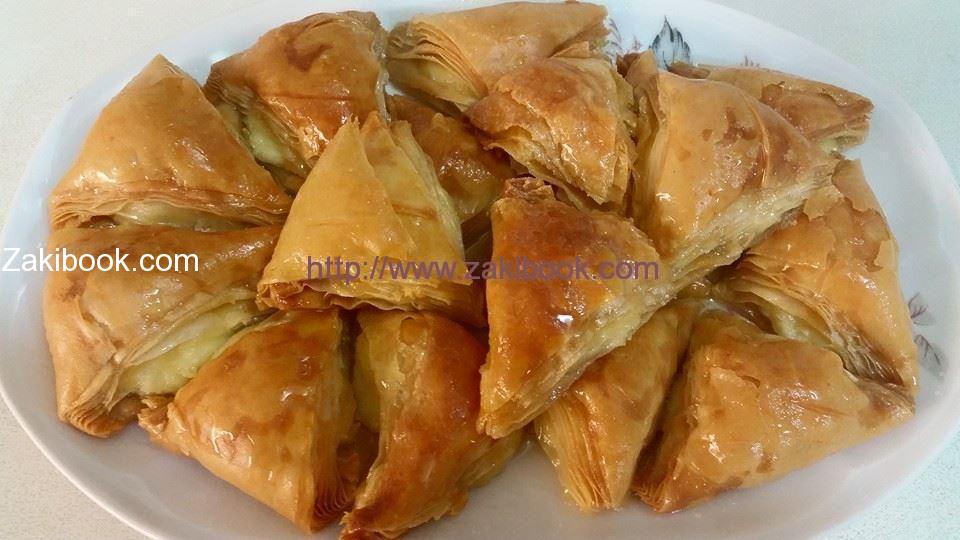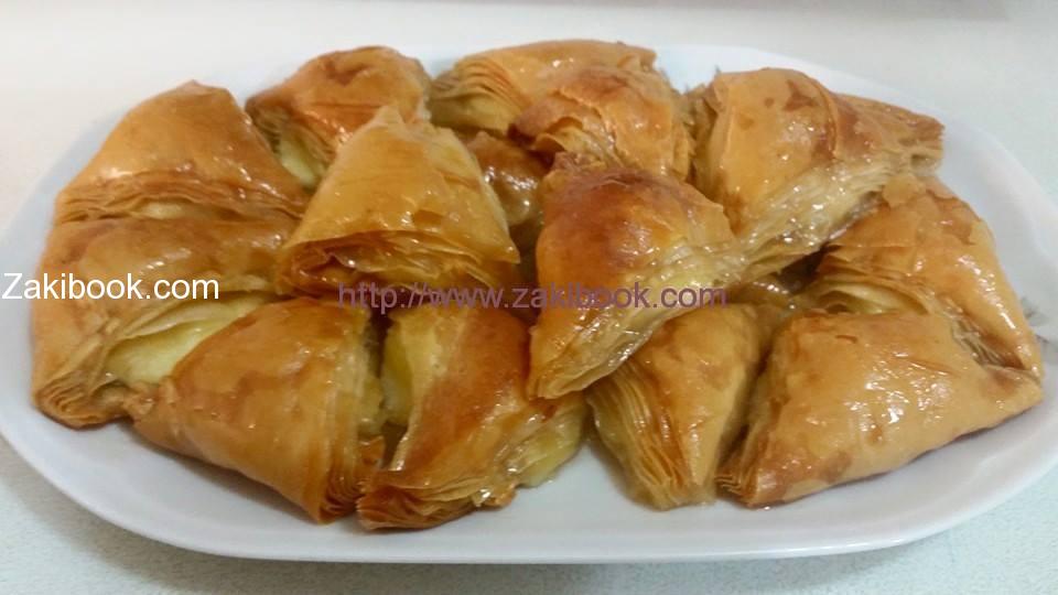 بعد ذلك نلفهم كلهم على شكل رول كبير، ونقطعه 5 أجزاء متساوية ، أو أقل حسب الحجم المطلوب حسب الرغبة ، ثم نأخذ كل لفة وتفرد وبطبقة طرفها على الثاني حتي نحصل على شكل مثلث ، وتقص بالسكين وتحشى بملعقة من الحشوة ، وتغلق جيدا ، وترص بصينية مدهونة ، وهكذا حتى نهاية الأجزاء ، بعدها نصب فوقهم الزبدة أو السمن الذائب ، وتدخل لفرن ساخن على درجة حرارة 150 من تحت و فوق لمدةة 45 دقيقة أو 1 ساعة حتى تنضج و تصبح ذهبية اللون