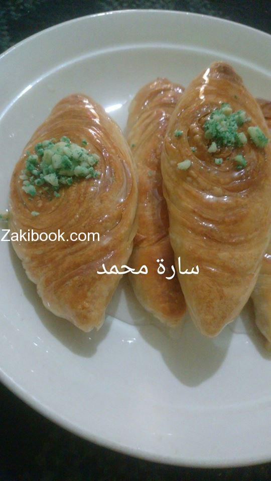 وبعدين بنقطع كور صغيرة ونفردها تكون رقيقة ونعمل 12 وحده ونحطها فوق بعض وبنرجع نفردها مع بعض ونلفها رول ونقطعو ونحشيها مكسرات حسب الرغبه ونحطها بصنيه مدهونه زيت منيح او سمن وندهن الوجه كمان وتوضع بالفرن وتسقي ب شراب ثقيل بارد