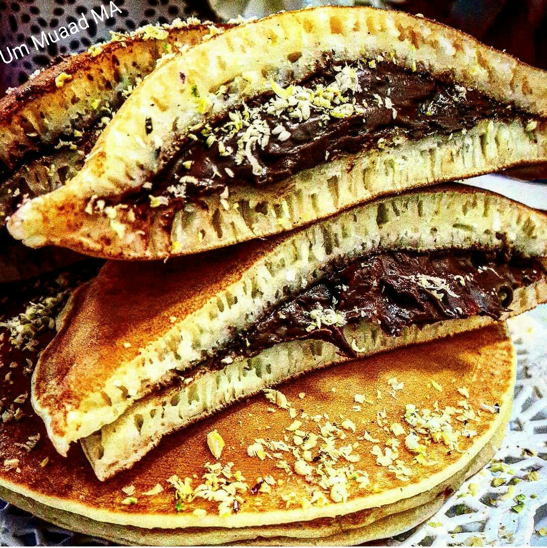 نعجن كل المكونات مع بعض حتى نحصل على عجينه مثل عجينه الكيك ونترك العجين يرتاح ربع ساعه و نسخن مقلايه تيفال سويتها زي حبات القطايف وبعد متستوي حبت البان اخرجها بدون مقلبها للوجه الثاني حتى نكمل الكميه ونتركهم يبردو ونحشها بنوتيلا ونسكرها بواحده ثانيه ويصير معانا قرص ونقطعه نصفين ونرش عليها فستق مثل مافي الصوره ويقدم