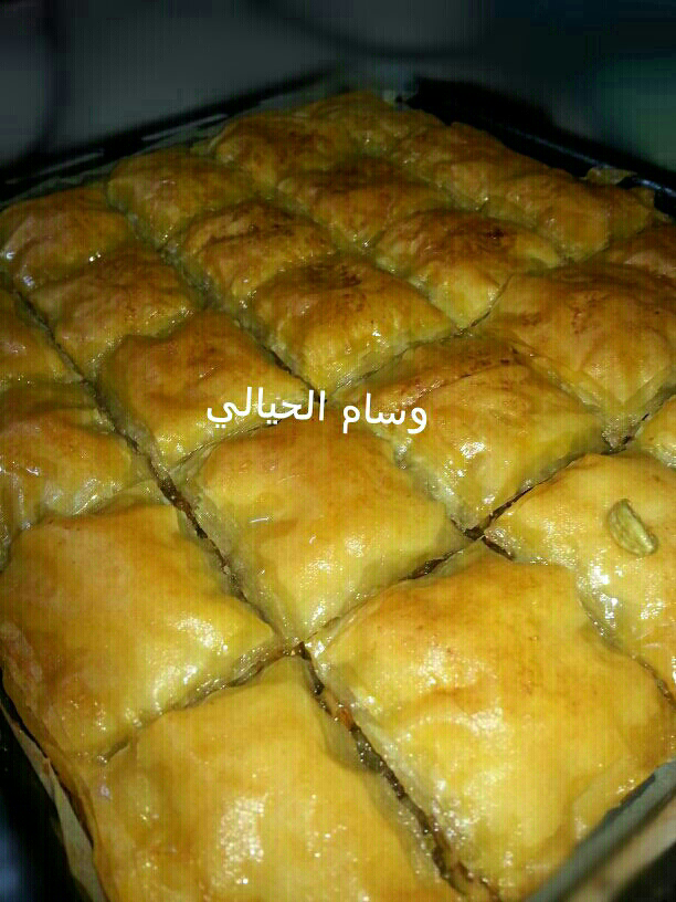 12قطعه وتفجيها بالشيبك عادي وتخلين بين قعطه وقعه كميه وفيره من النشا.بعدين بالنشابه(شوبك خاص بالبقلاوه)تفجين القطع مع بعضها وتذرين نشا حتى ماتلتصق القطع مع بعضها وبعدين تشيلين قطعه قطعه وتفجيها رقيقه جدا لحد مايصير شكلها قرص دائري كبير.وطبعآ مراح تتشقق لأن بيها نشا.وتقصيها بقياس الصينه الدتشويها بيها.انا عملت صينيه صغيره وقطعت القرص وخليت شي فوق شي طلع عندي تقريبآ46قطعه بحجم صينيه صغيره..بعدين خليت بالاسفل26قطعه دهنت كل قطعه بالزبد.وخليت الحشوه وبعدين خليت فوهم20قطعه وهم دهنتهم قطعه قطعه بالزبد.وقصيت البقلاوه قبل لاادخلها الفرن.وصبيت كوب زبد ذايب فوقها ودخلتها فرن حامي بدرجة حراره190لمدة15دقيقه او حسب الفرن.ومن استوت طلعتها من الفرن ميلتها وشلت الزبد الزايد ومباشرتآ صبيت فوقها الشيره البارده.