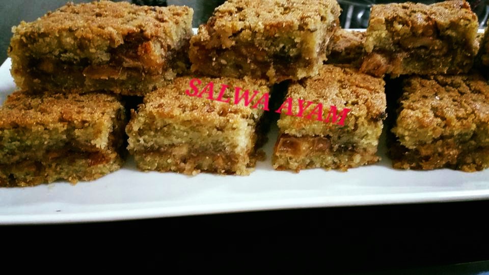 ويمكن اضافة حبة البركه حسب الرغبه ونفرد نصف العجين بصينية الفرن باستخدام اليد ونقوم بتوزيع كميه وافرة من التمر المقطع او العجوة حسب الرغبه فوق العجين ونوزع فوق التمر كمية من الجوز بدون طحن