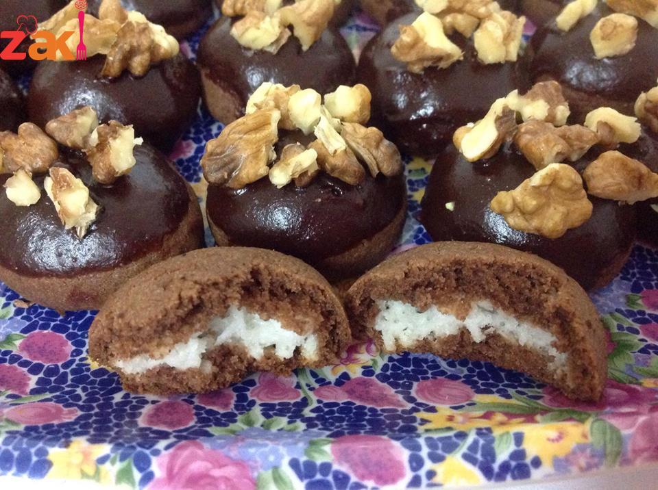 تخلط مكونات الحشوة وتوضع الحشوة في الثلاجة ايضا مدة ساعة او اقل وتستعمل نعمل من عجينة البتيفور كور ثم نحشيها بكرات صغيرة من الحشوة وتخبز في الفرن وبعدها يبرد وتغمس القطع بالشكولا المذابة وتزين بالمكسرات وتقدم.