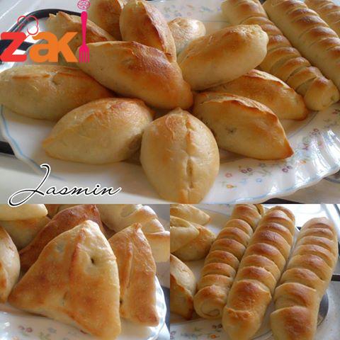 كاستين ونص طحين ومعلقة طعام سكر ومعلقة طعام خميرة ورشة ملح ونص كاسة مي ونص كاسة لبن دافيين وربع كاسة زيت نباتي نخلطهن ونغطي العجينة لتخمر تقريبا ساعة ونشتغل فيها
